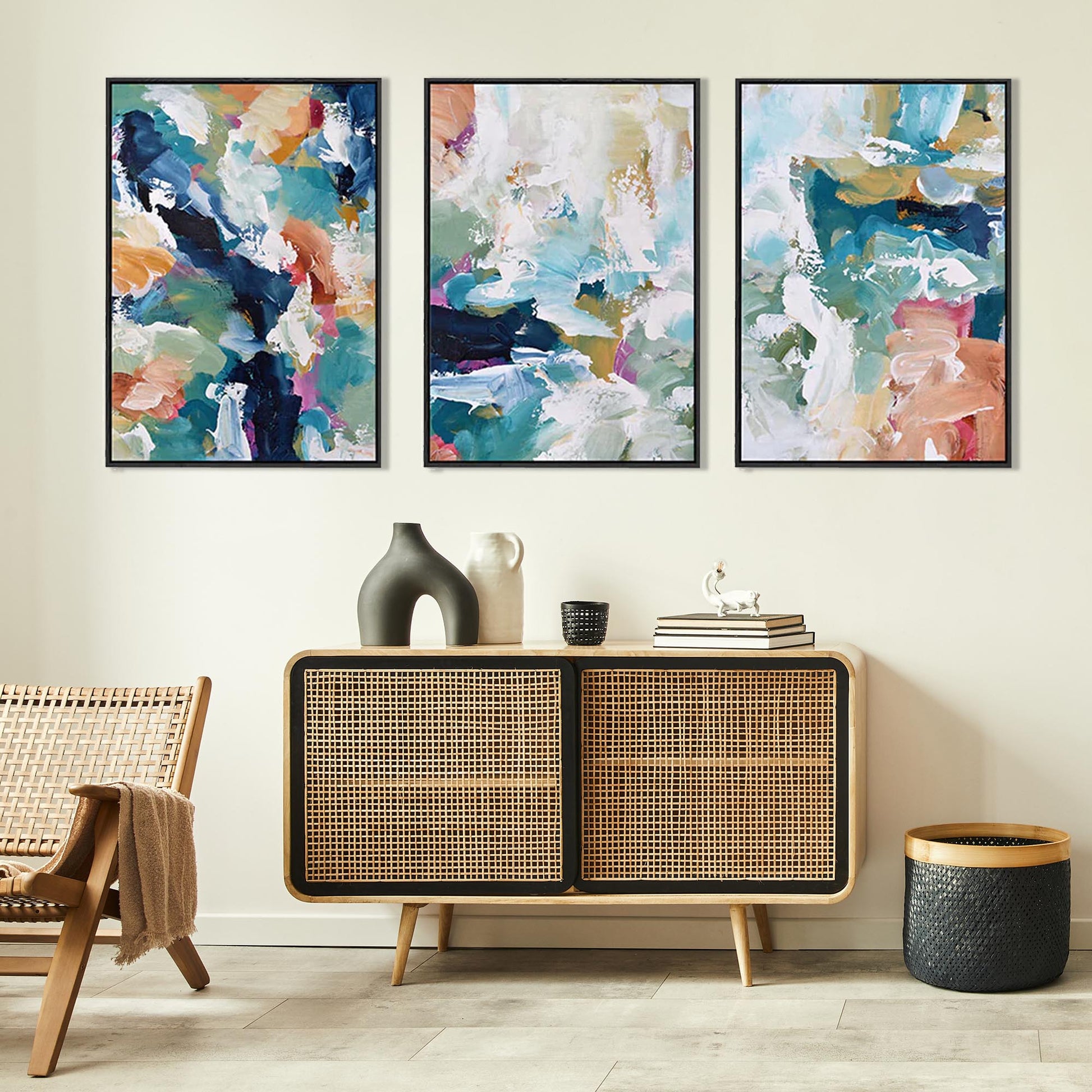 This beautiful vibrant canvas set has a colourful palette with blush strokes, baby blue and teal combining over a white layer. A refreshing set of artwork that will add that pop of colour to any space.