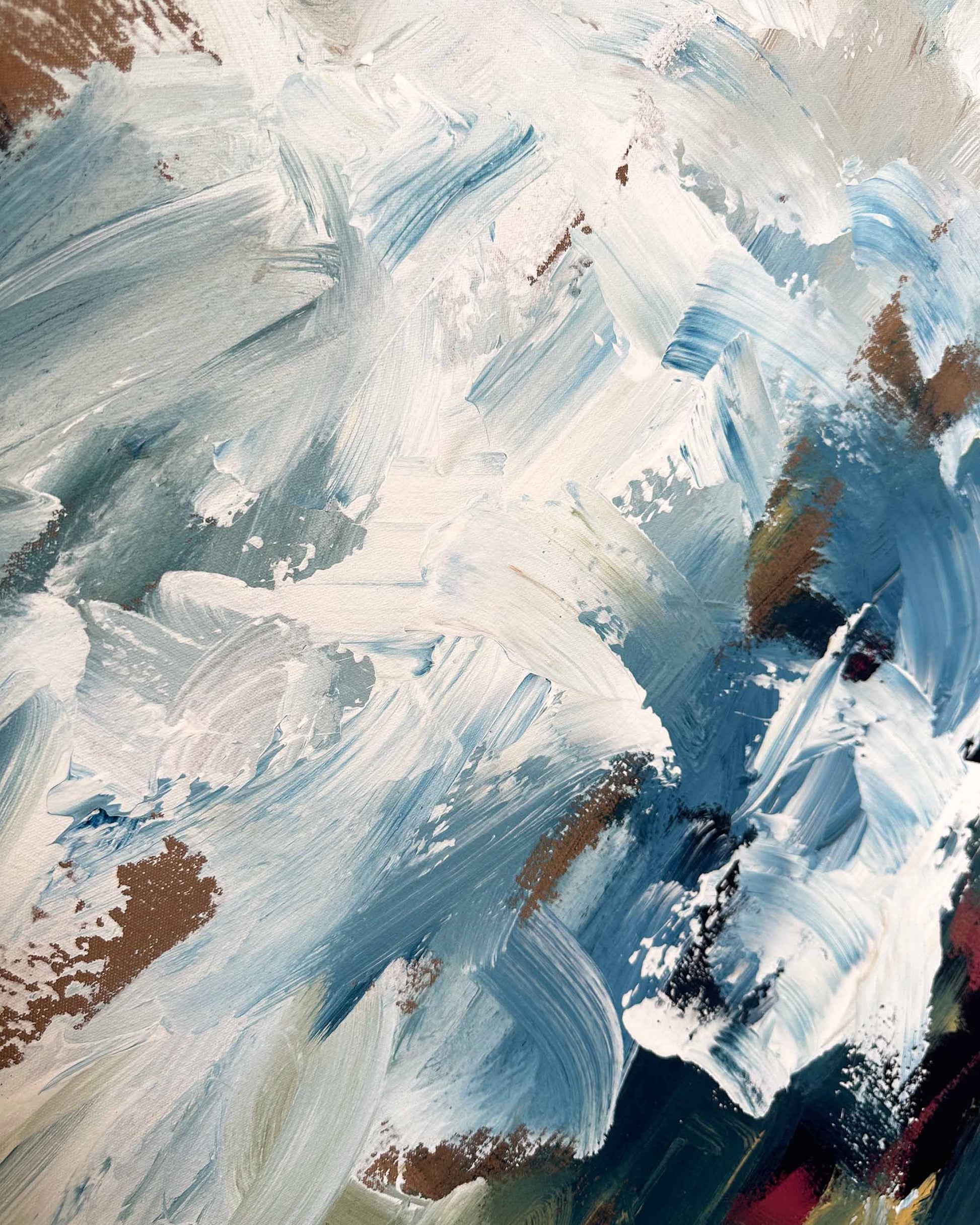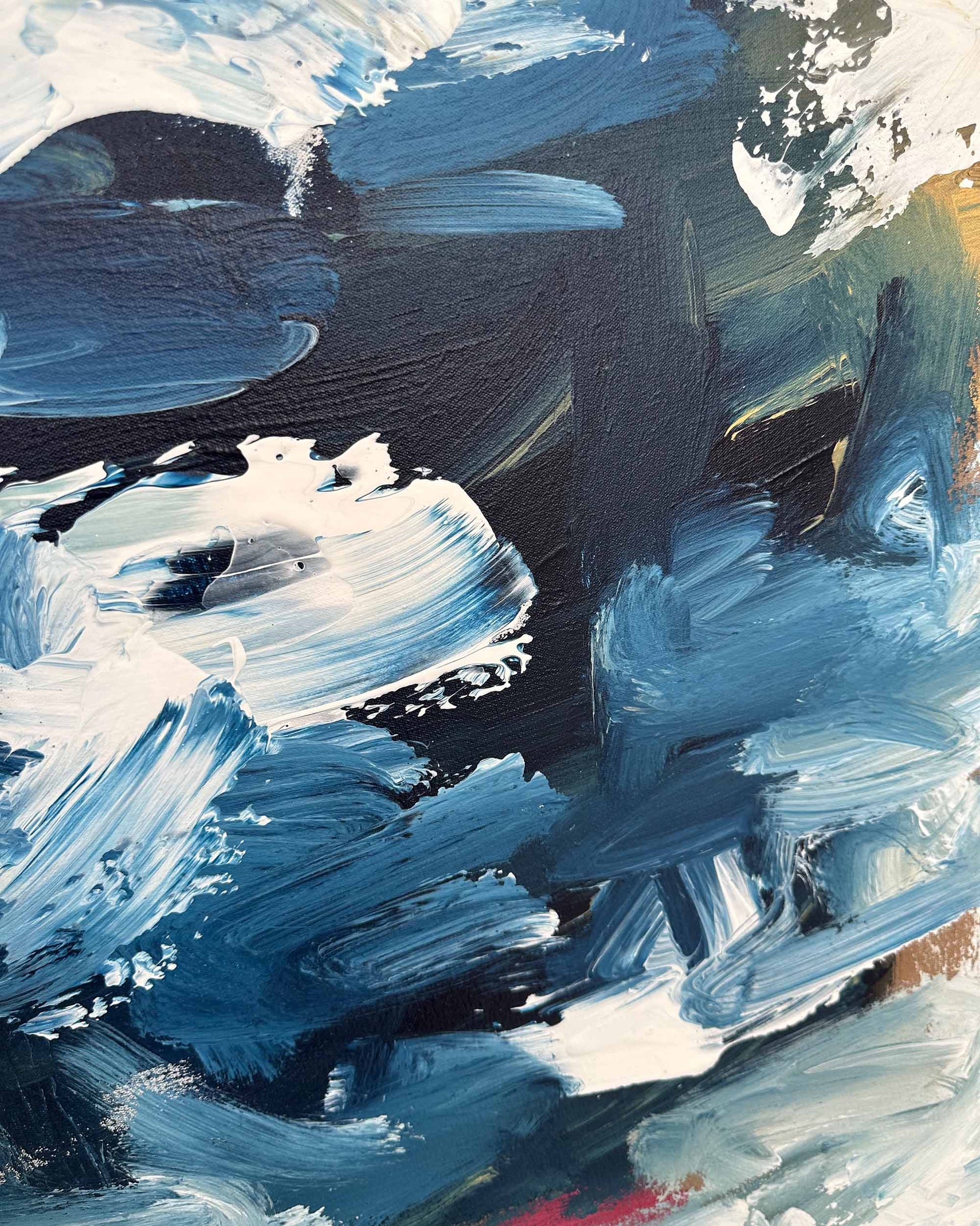 Elevate your space with "Endless Dreams II," a large original painting by Omar Obaid showcasing his signature style. Measuring 150x90cm, this striking artwork features navy blue and white hues with warm undertones, brought to life through textured pallet knife techniques. The rich layers and dynamic composition make it a captivating centerpiece that adds depth and elegance to any room.
