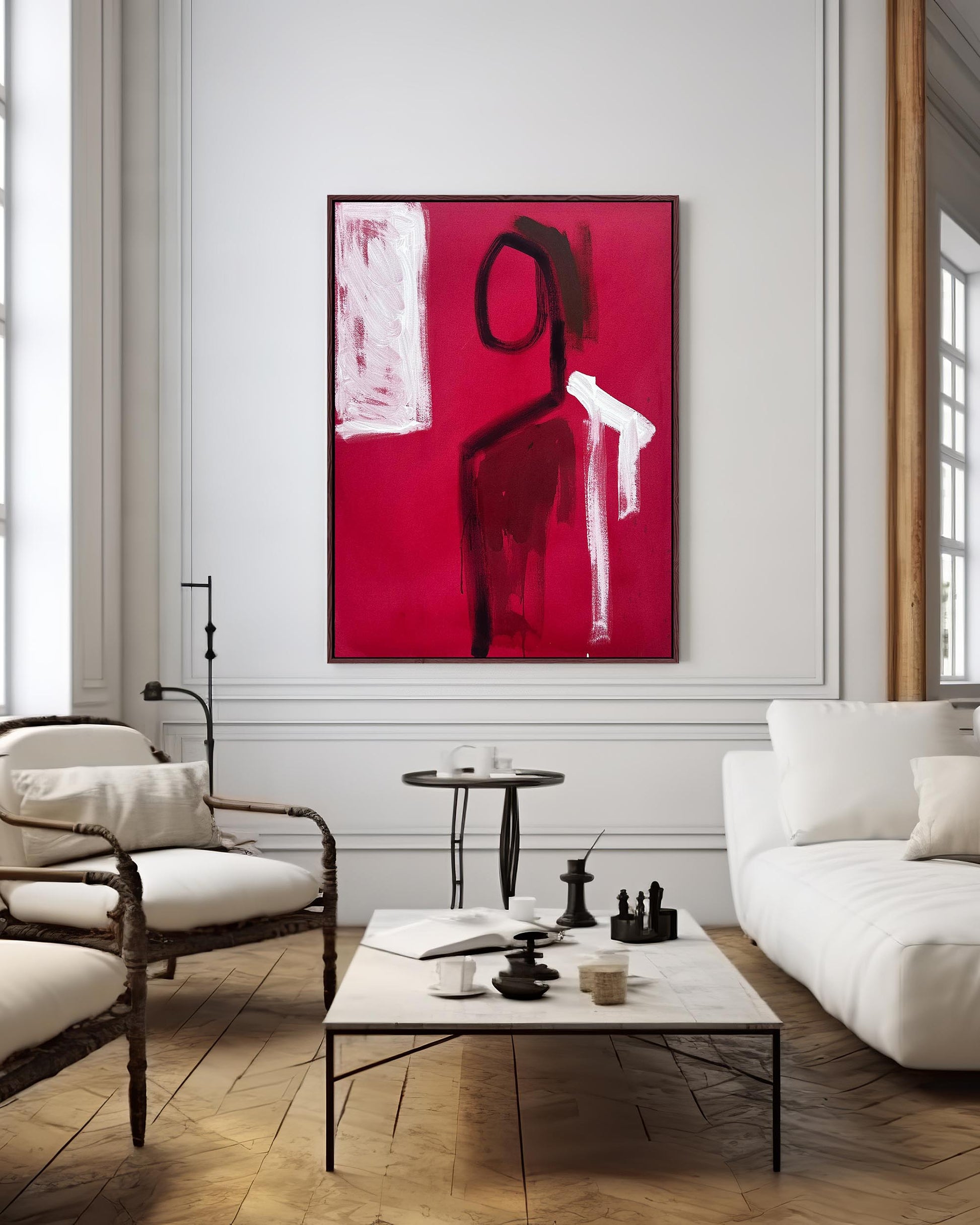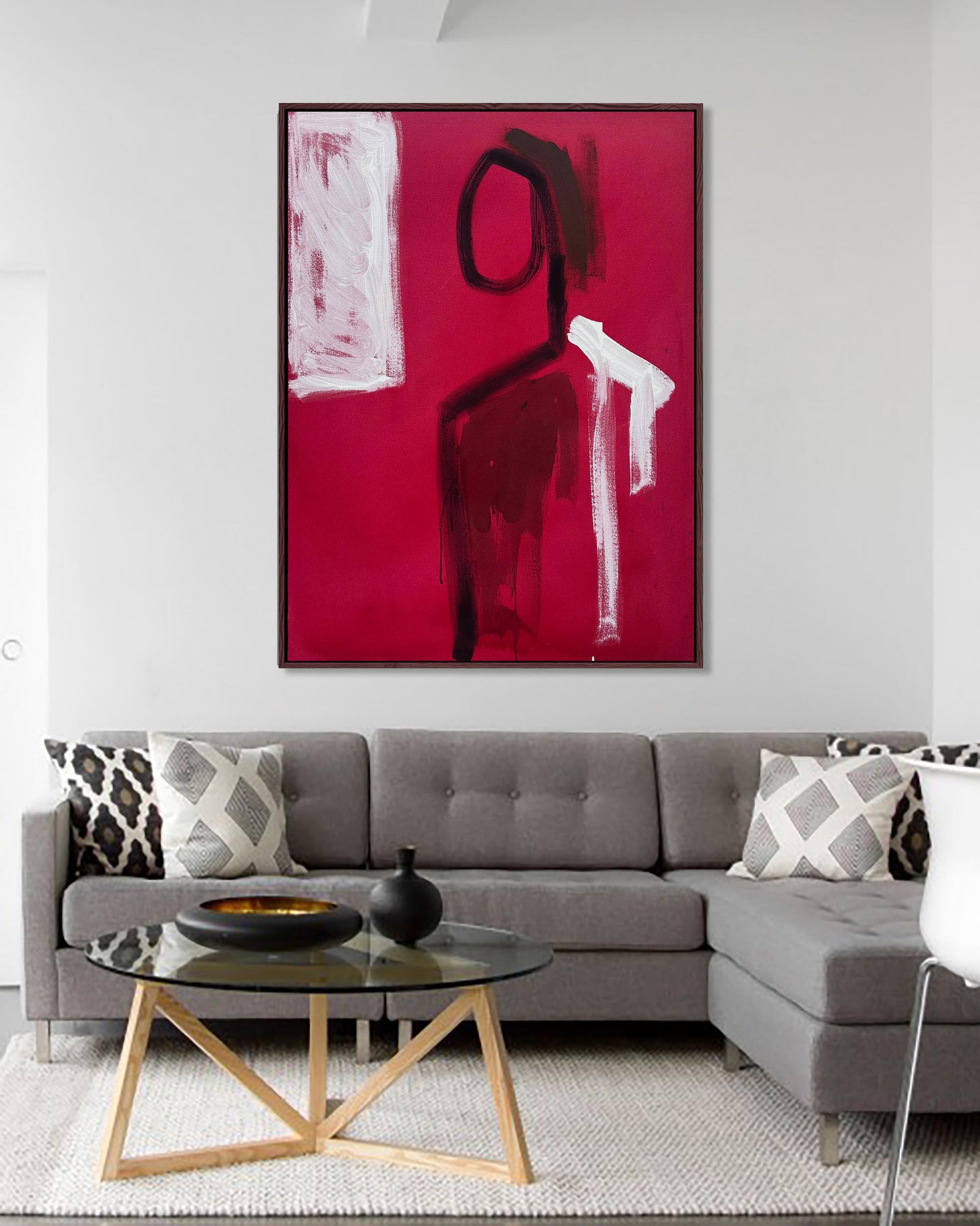 From a new series by local London artist Omar Obaid, this abstract expressionist original painting features abstract figures. Set in magenta woods, this acrylic painting on canvas expresses a story set amongst tall red acer trees, with it's rich magenta-pink background and black and white brush strokes. A favourite amongst interior designers, this unique painting will soon be hanging pride of place in your space.
