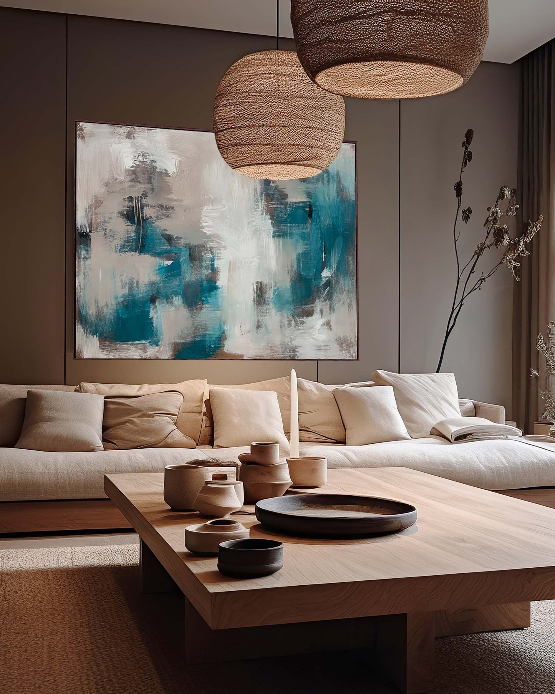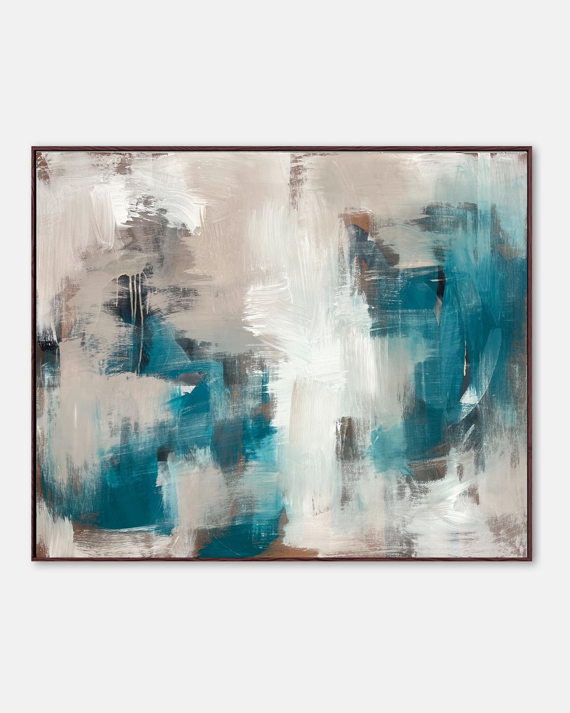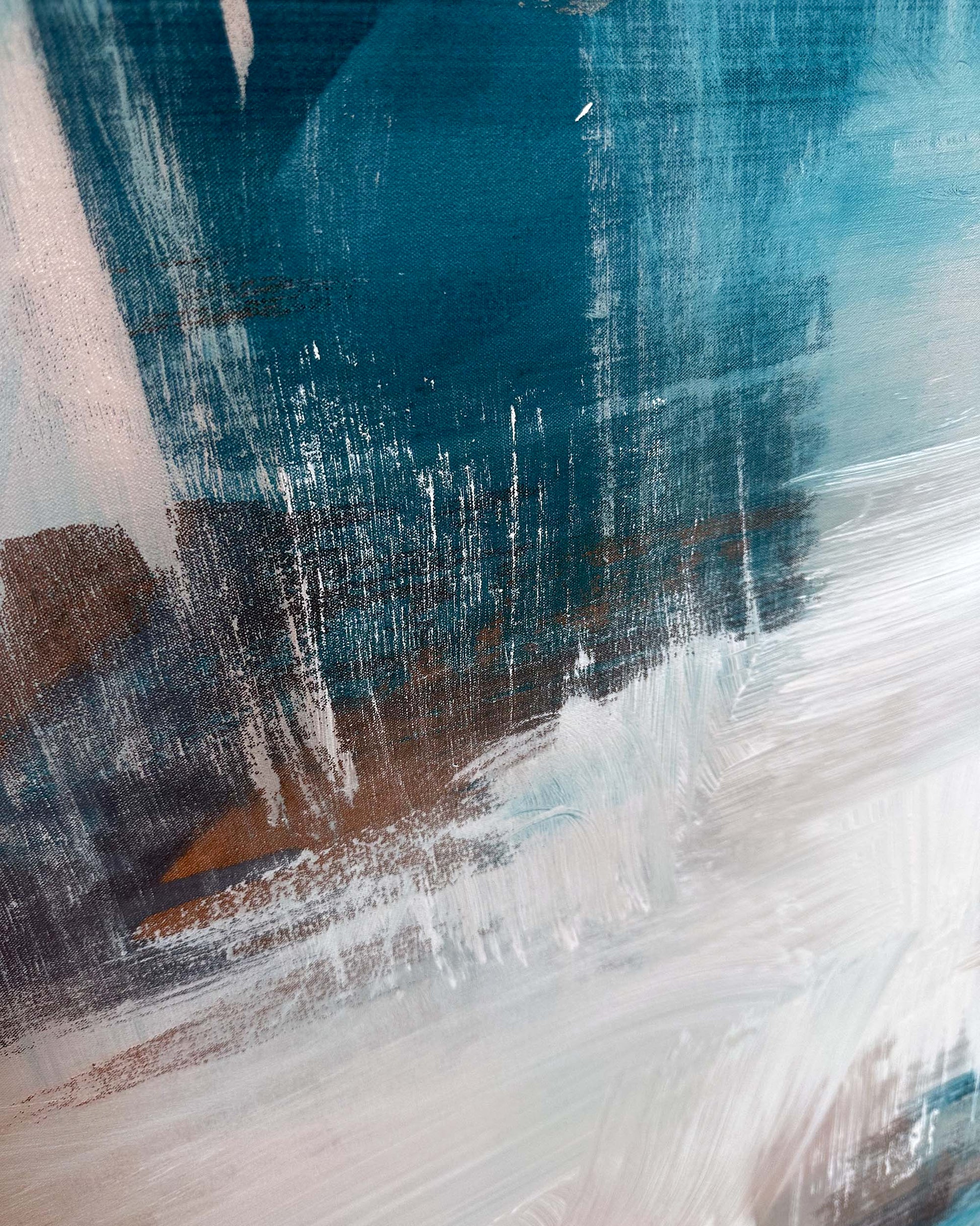 Make a bold statement with "Good Intentions III," an extra-large original painting measuring 150x120cm. This striking abstract canvas features a rich teal background layered with sweeping white and beige brushstrokes, creating a dynamic and balanced composition. Perfect for adding depth and contemporary flair, this artwork transforms any space into a captivating visual experience.