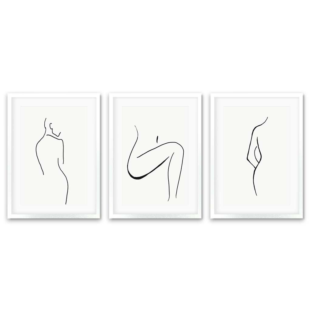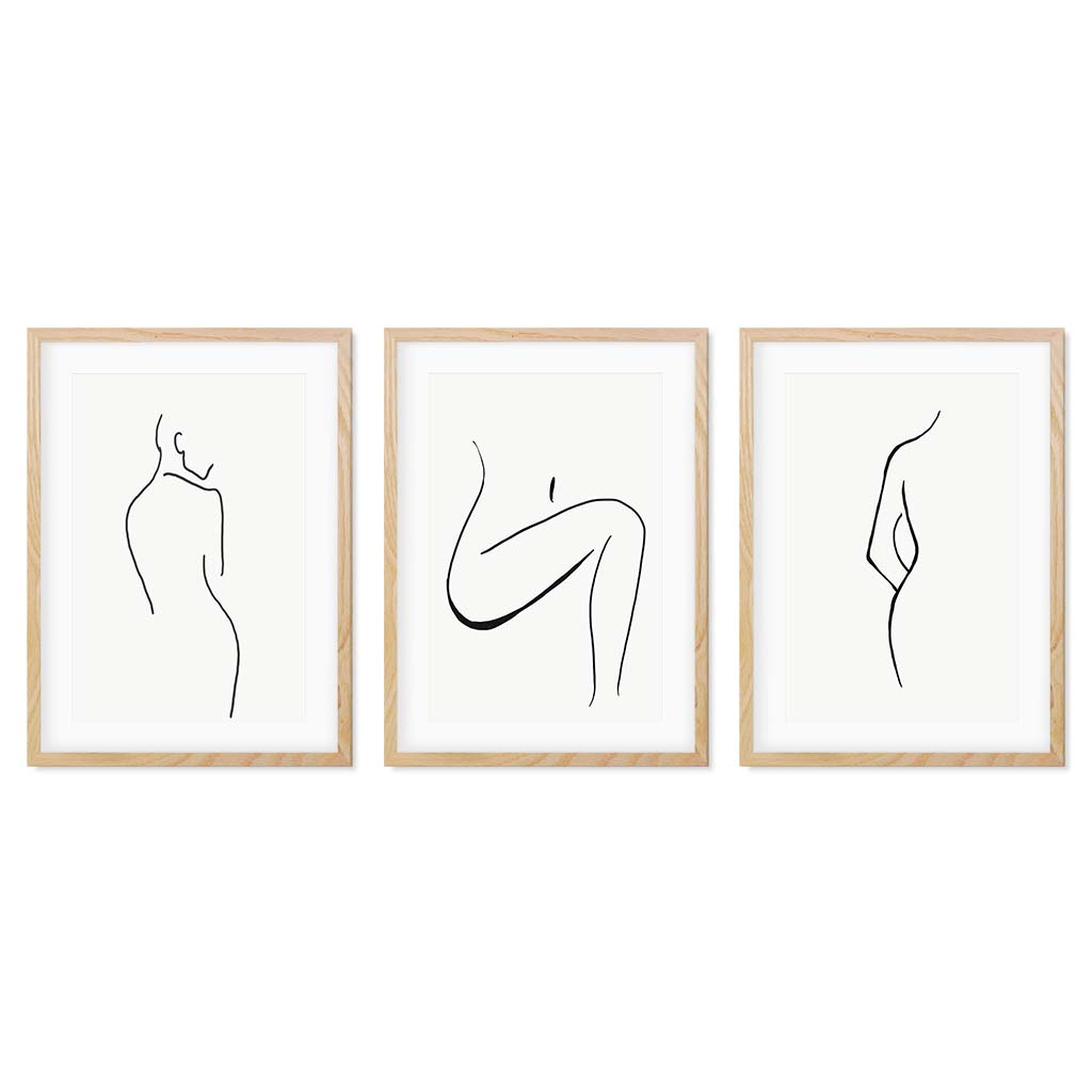 A set of three prints, one woman looking over her shoulder, one of her arched leg and one interpretation from behind. A modern and minimalist set.