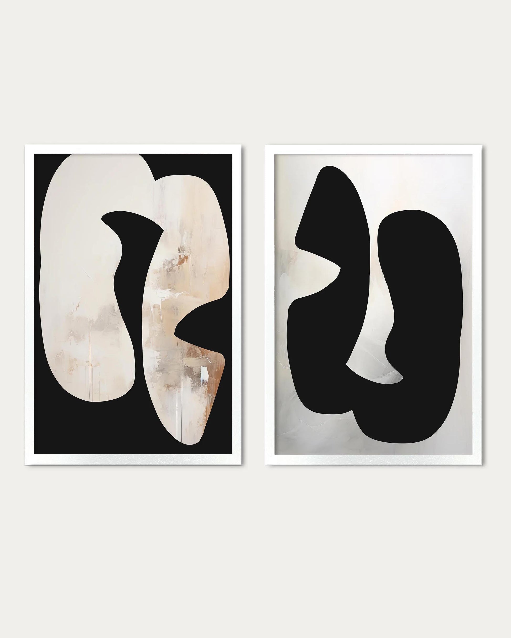 Elevate your space with this striking black and white monochrome art print set. A modern wall art print set with two contrasting abstract shapes in a refined black and white colour palette.