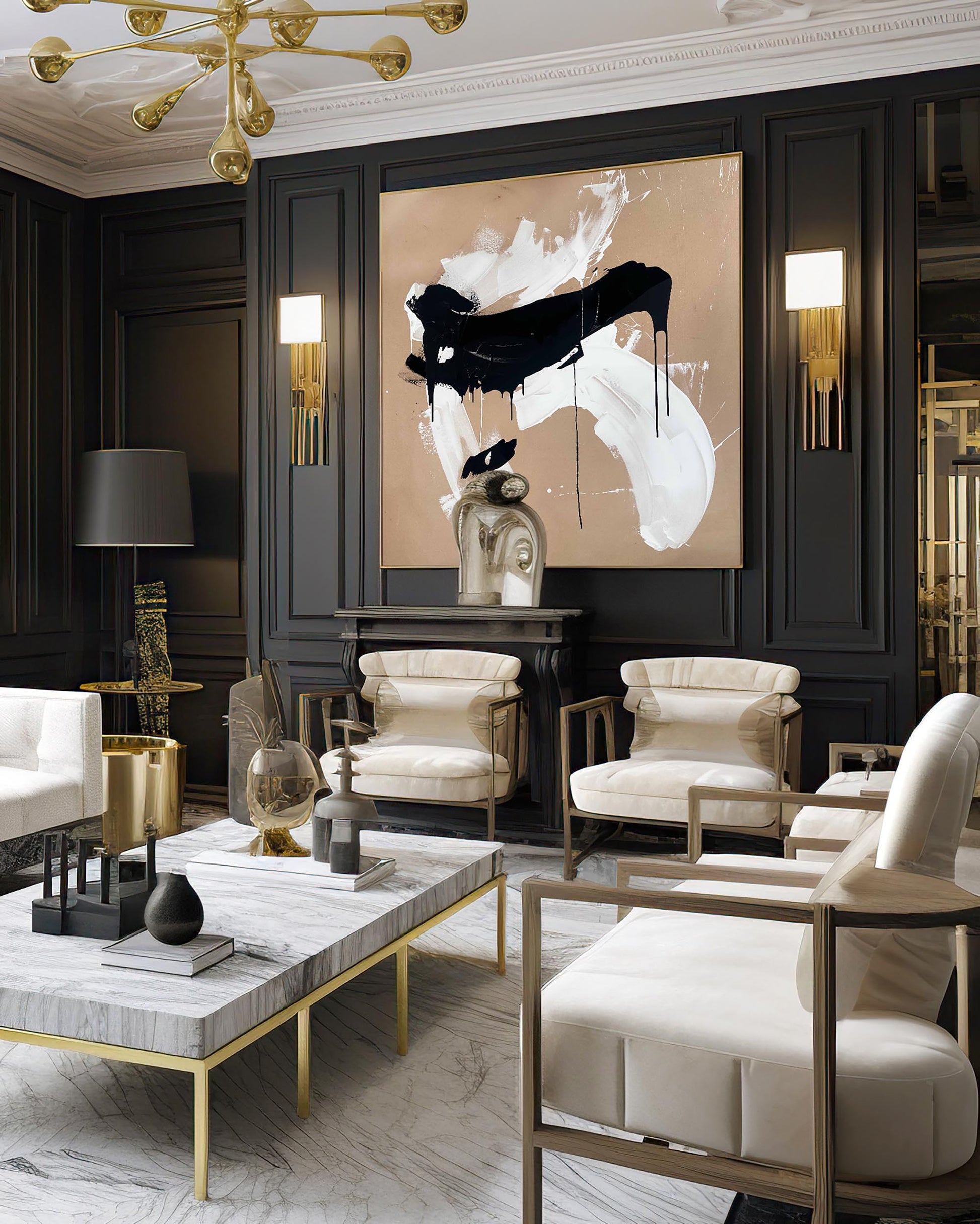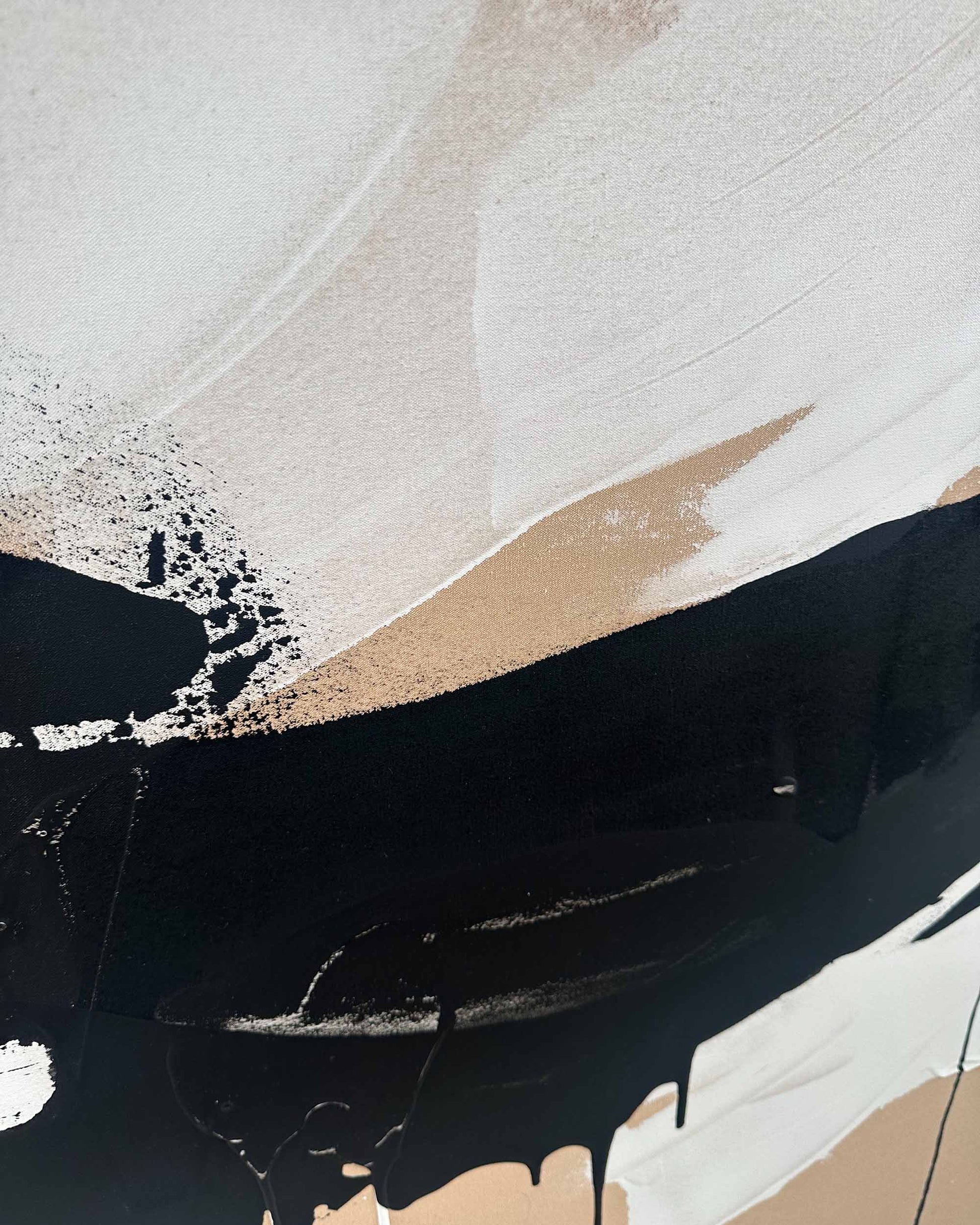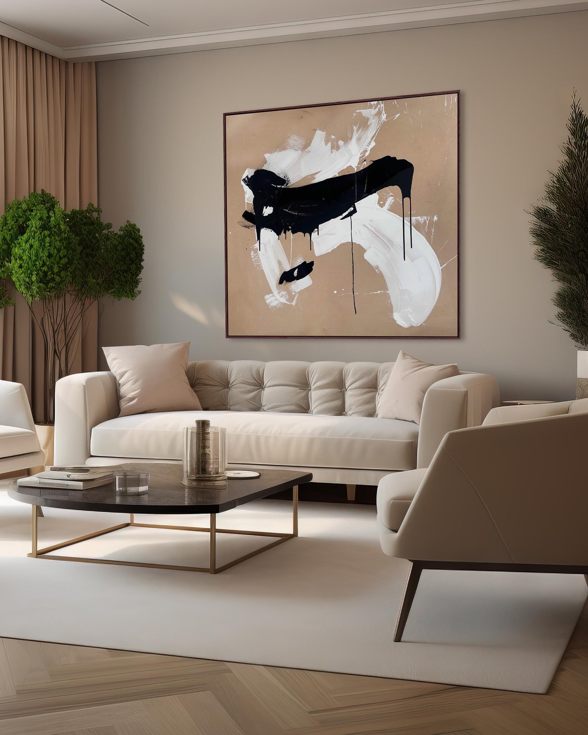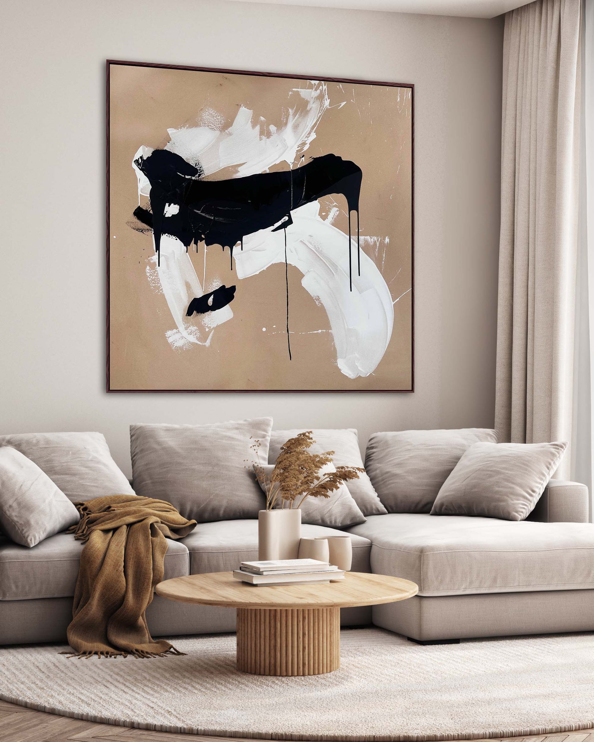 Make a striking impression with "Precious Time," an extra-large original painting by Omar Obaid. Measuring 150x150cm, this contemporary abstract artwork features dynamic black and white fluid paint layered over a warm orange-beige canvas. Its expressive composition and bold contrasts create a captivating visual energy, perfect for transforming any space into a modern art showcase.