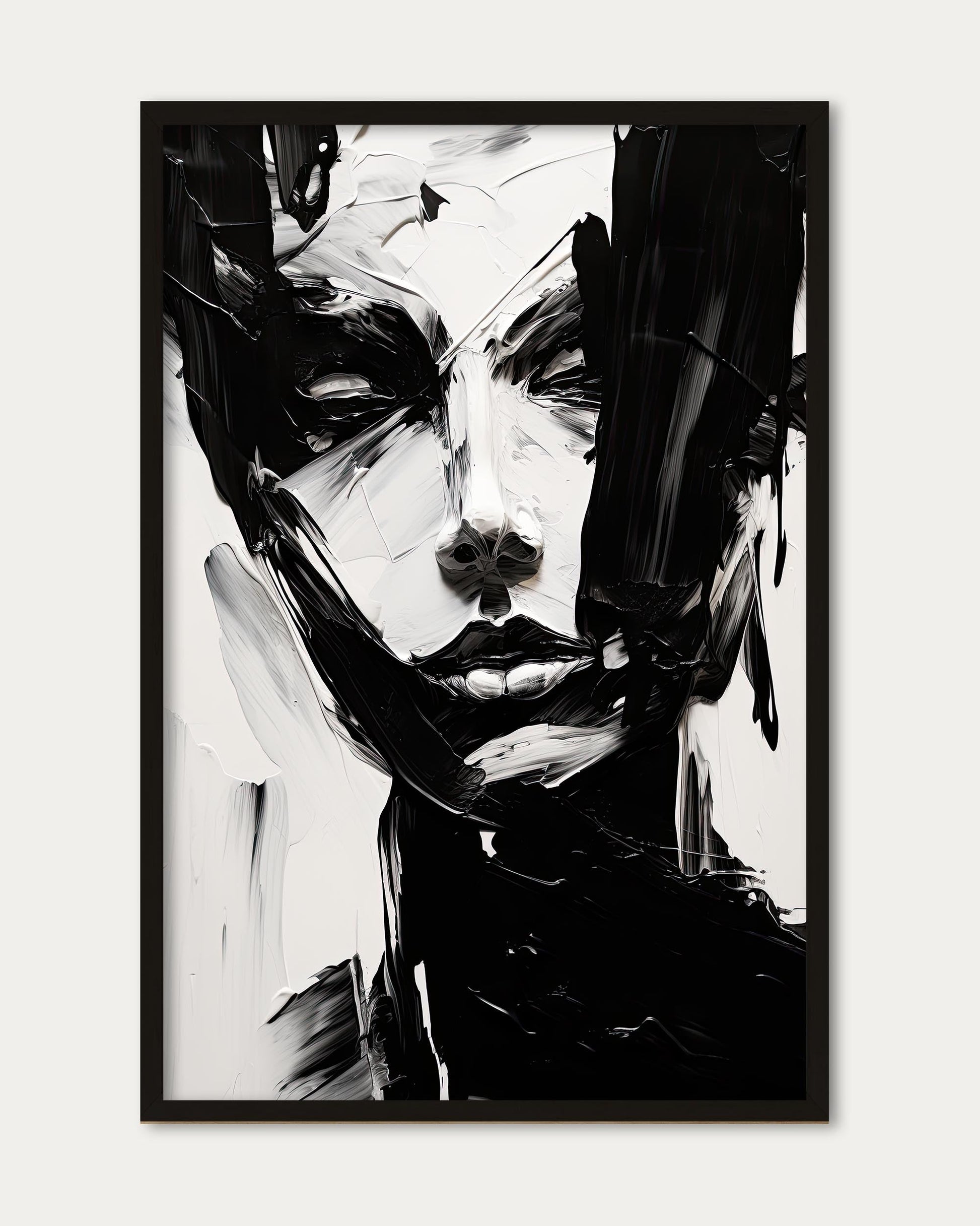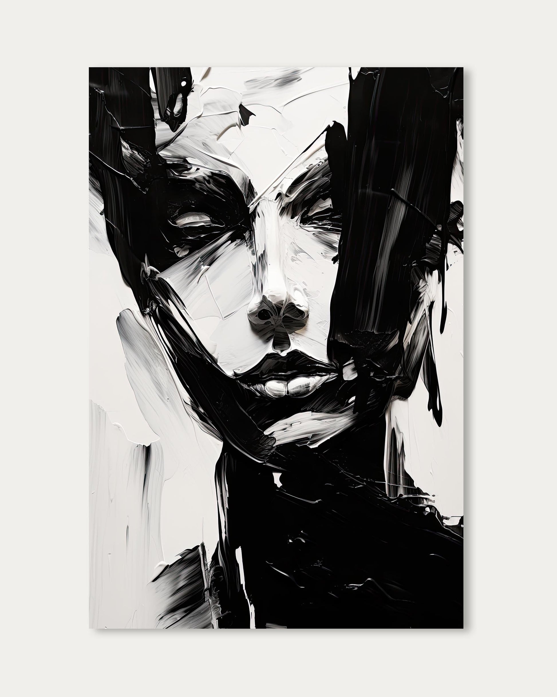 The Rhonda Portraiture Art Print features a bold black and white abstract face capturing expressive emotions with striking lines. This powerful artwork adds dramatic flair and contemporary edge to any space, perfect for enhancing your décor with artistic intensity and modern style.