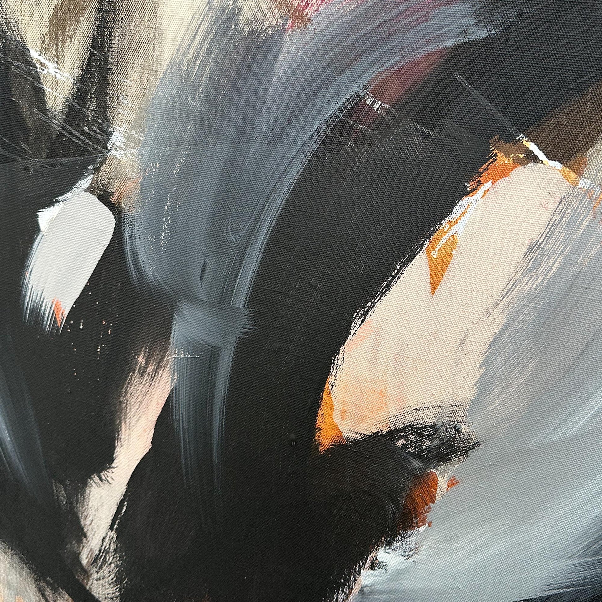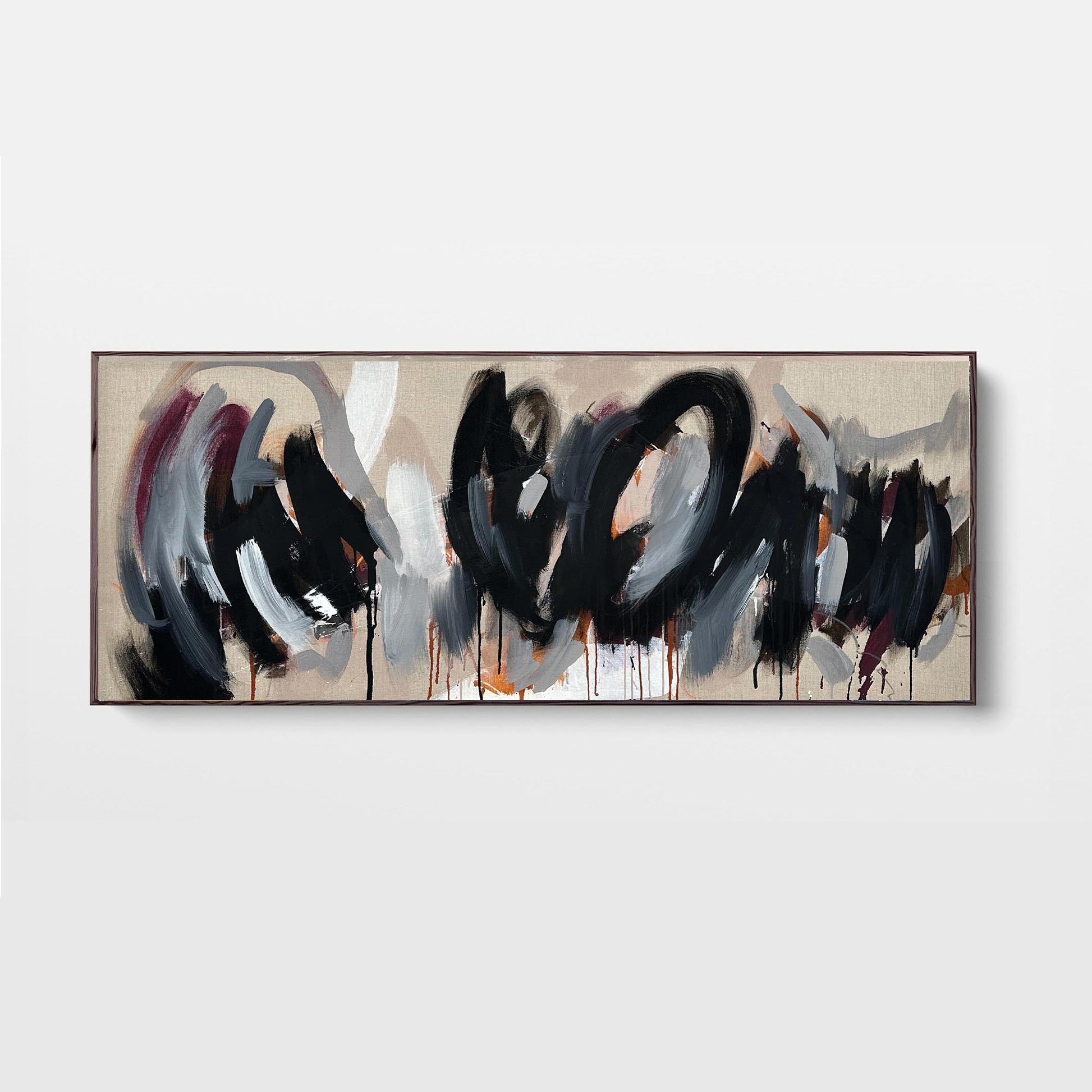 This extra large painting by artist Omar Obaid showcases black swirls over layers of paint colours in an abstract, contemporary style. Measuring 200x75cm, this modern piece is painted on premium linen canvas and comes with a sleek frame. Make a statement with this unique and high-quality artwork.