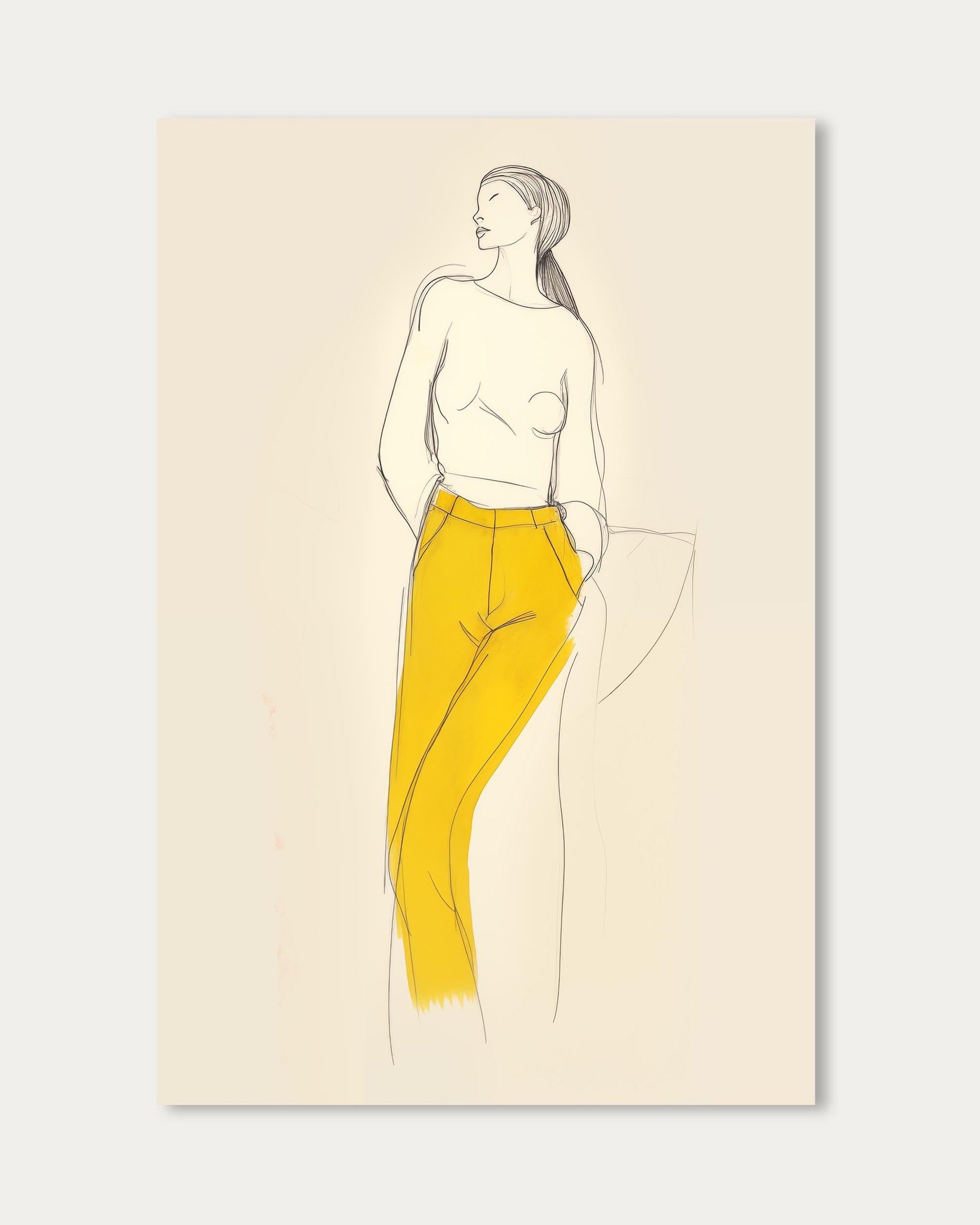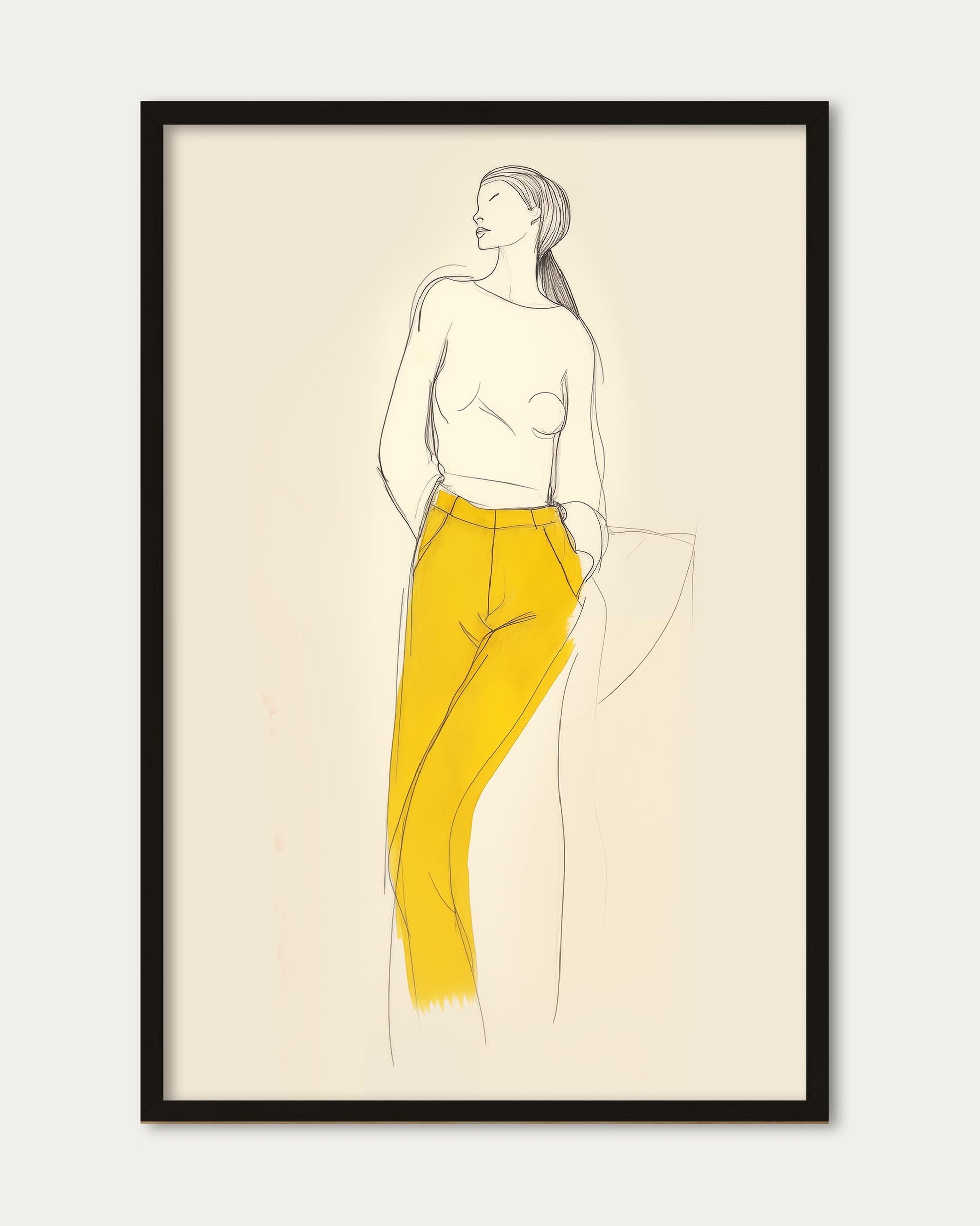 Elevate your space with the Sketch Study Art Print, a stylish figurative fine art piece featuring a fashion sketch of yellow trousers. This elegant artwork brings a touch of creativity and modern sophistication to any room, perfect for fashion enthusiasts and art lovers alike.