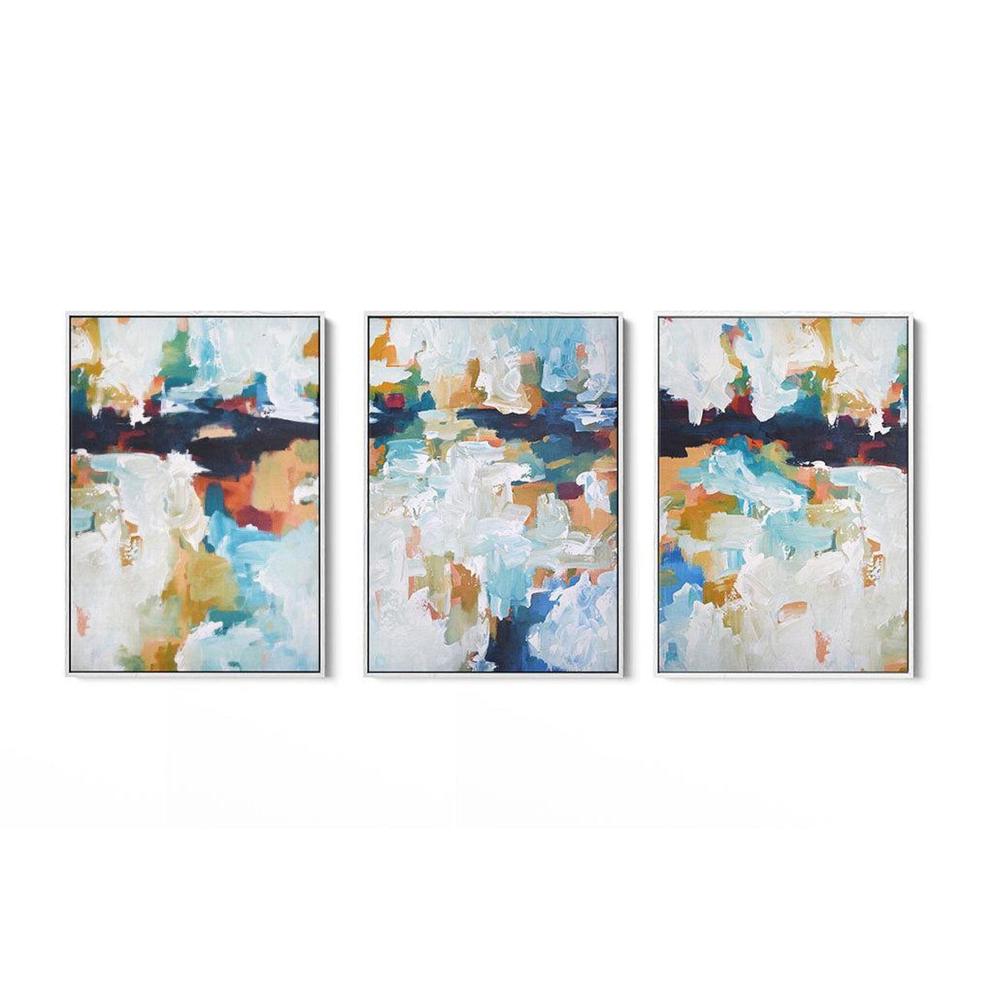 A mixed colour palette of blue, teal, white, and orange features in this abstract set of three canvas art prints.