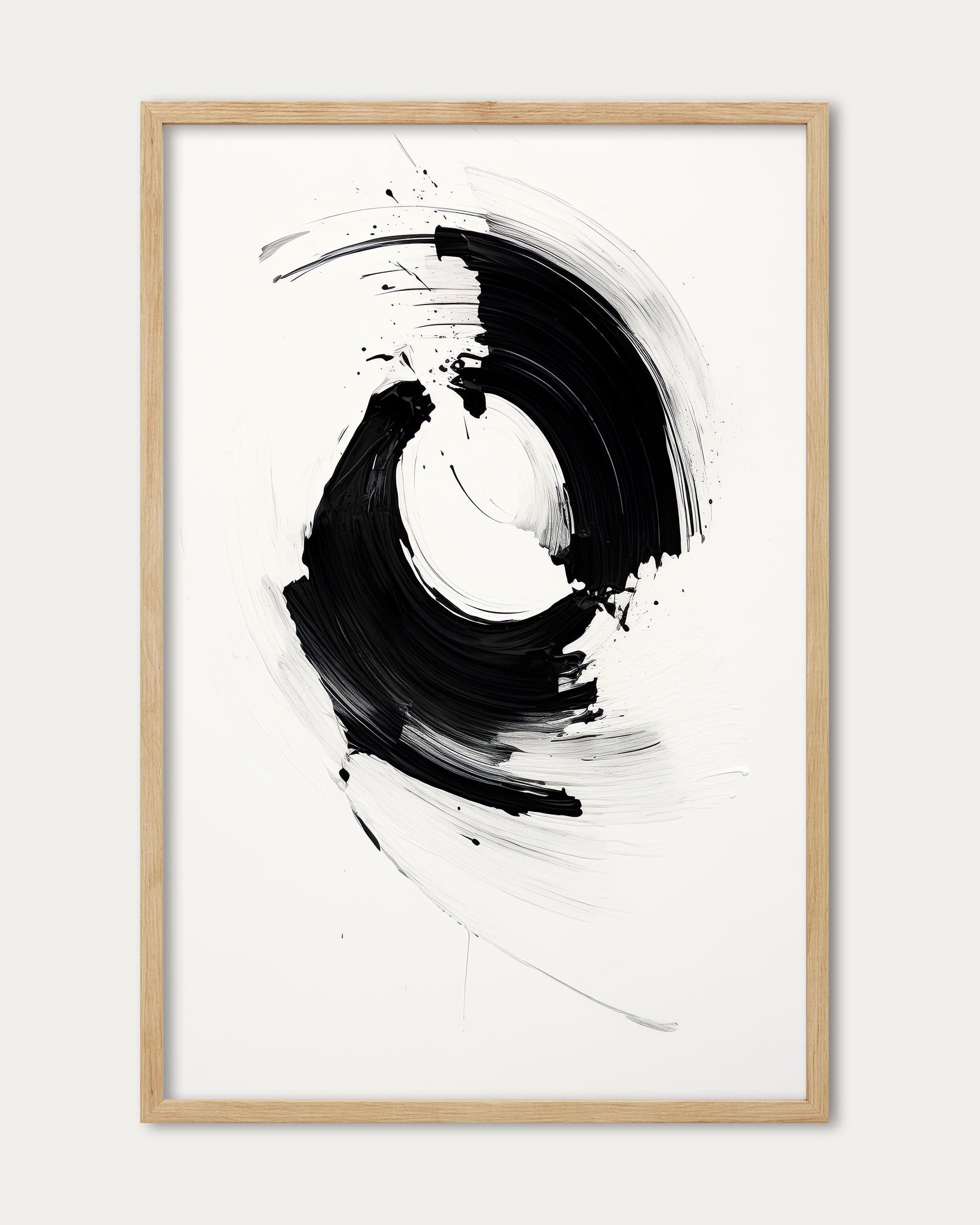 The Spinning Wheel Art Print features a modern black and white design that combines bold lines and dynamic forms. This striking artwork adds contemporary elegance and visual impact to any space, perfect for enhancing your décor with stylish simplicity and artistic flair.