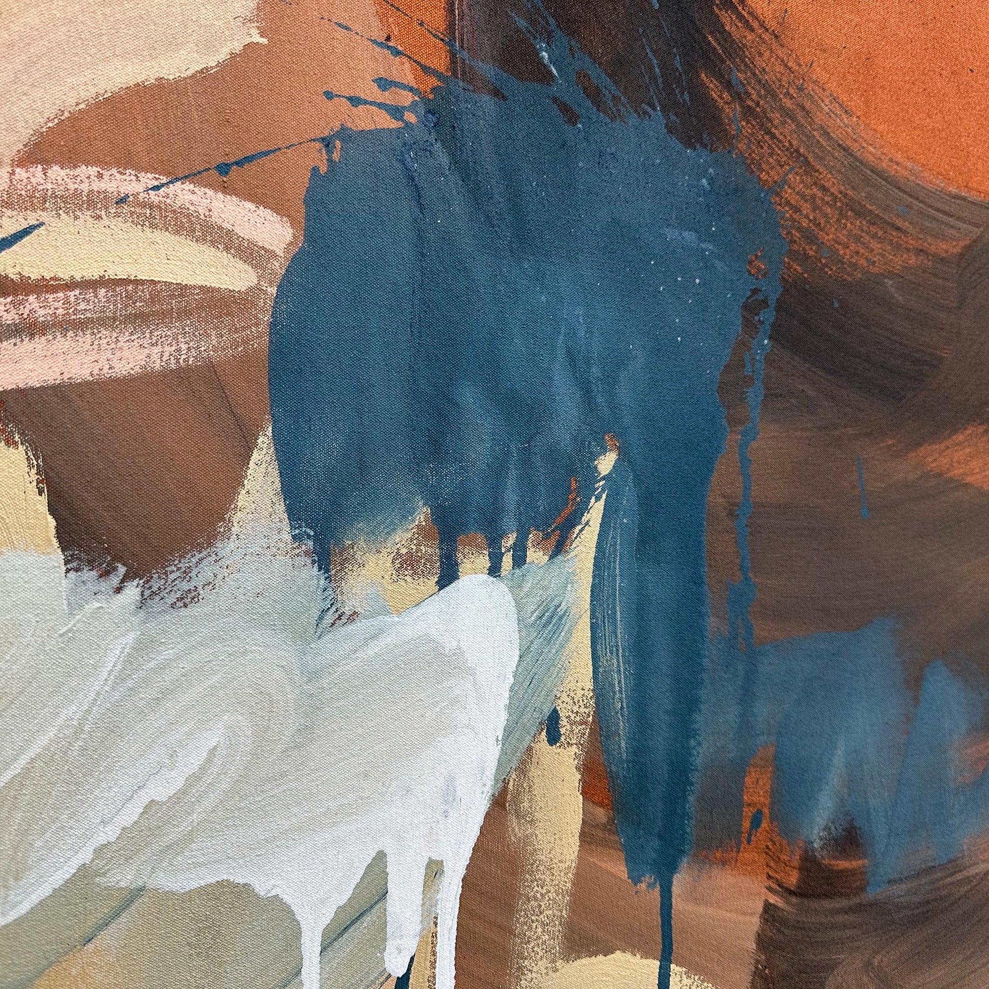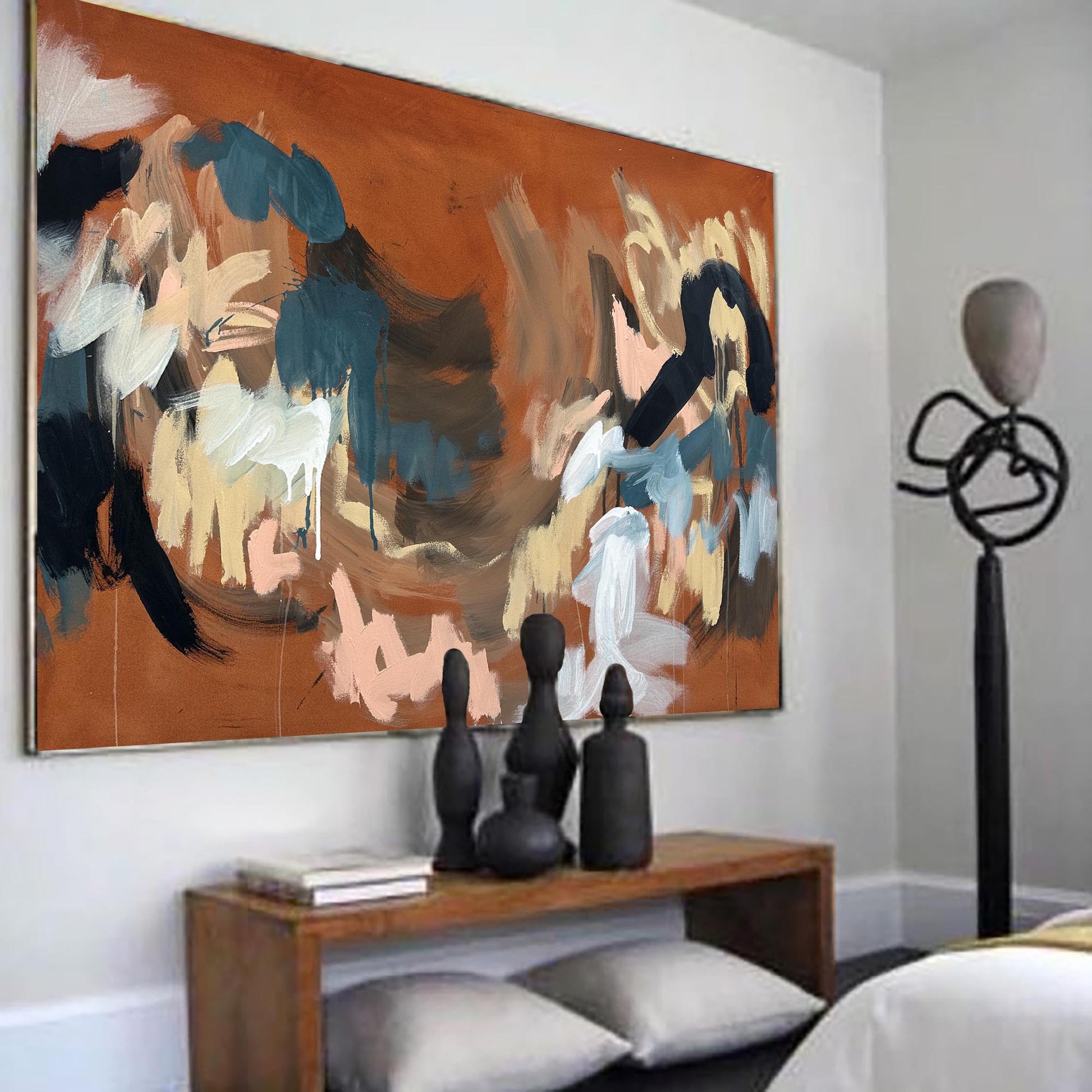 Expertly created by artist Omar Obaid, "What I Should Have Said" is an extra large, 150x100cm painting that brings a sense of adventure to any contemporary space. With fluid brushstrokes of vibrant colours on a burnt orange background, this abstract piece elevates any room with its bold and modern aesthetic.