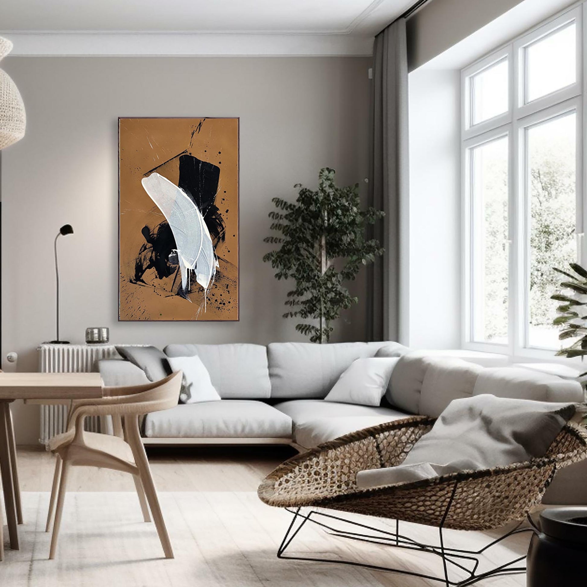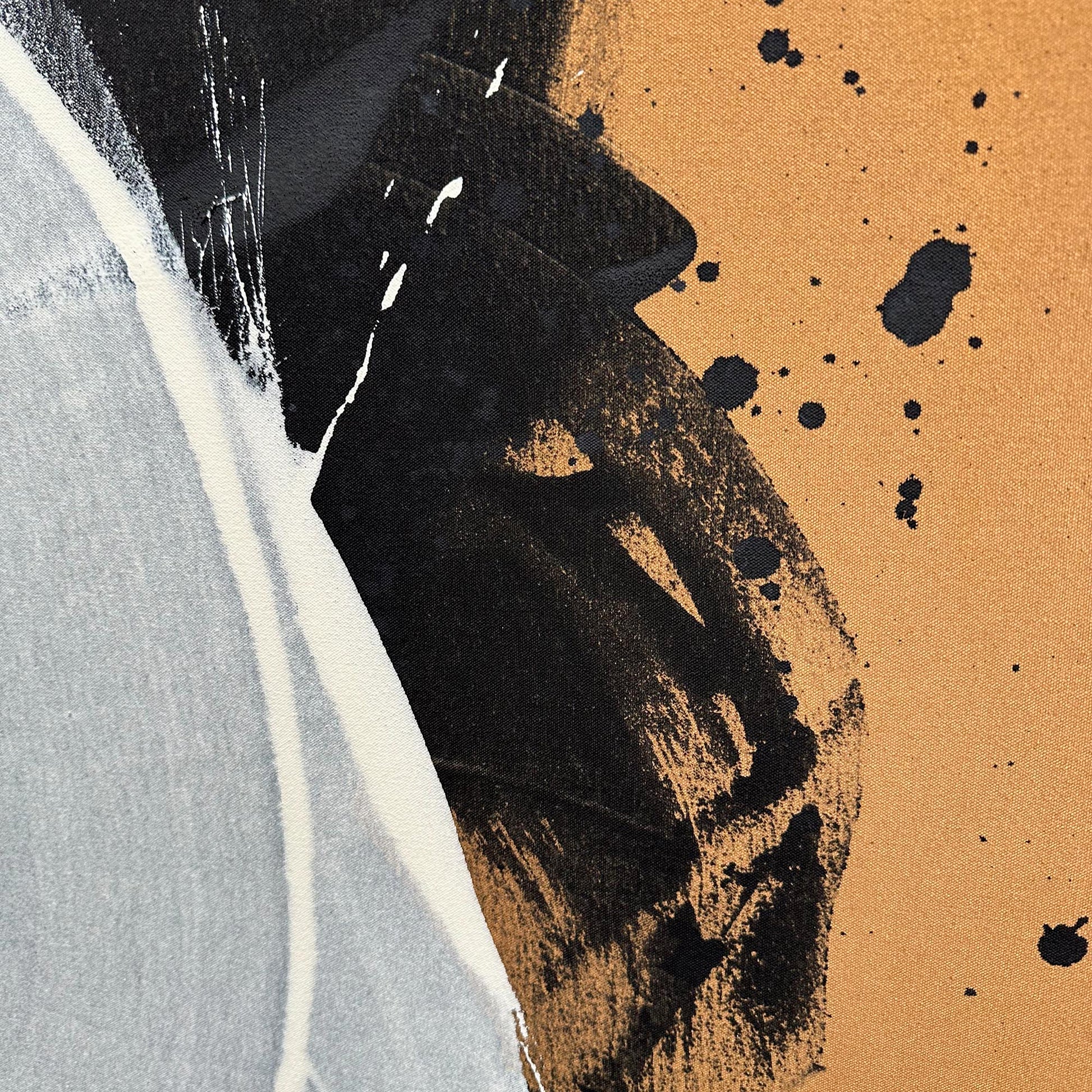 Carry On Dreaming is an extra-large, one-of-a-kind original abstract painting by London-based artist Omar Obaid. This framed artwork features expressive gestures and dynamic fluid paint in white and black on a rich sienna background, enhanced by striking paint splatters. Signed by the artist, it offers a unique opportunity to own a distinctive piece that brings bold contemporary energy and captivating movement to your space. Don’t miss the chance to make this exceptional work yours.