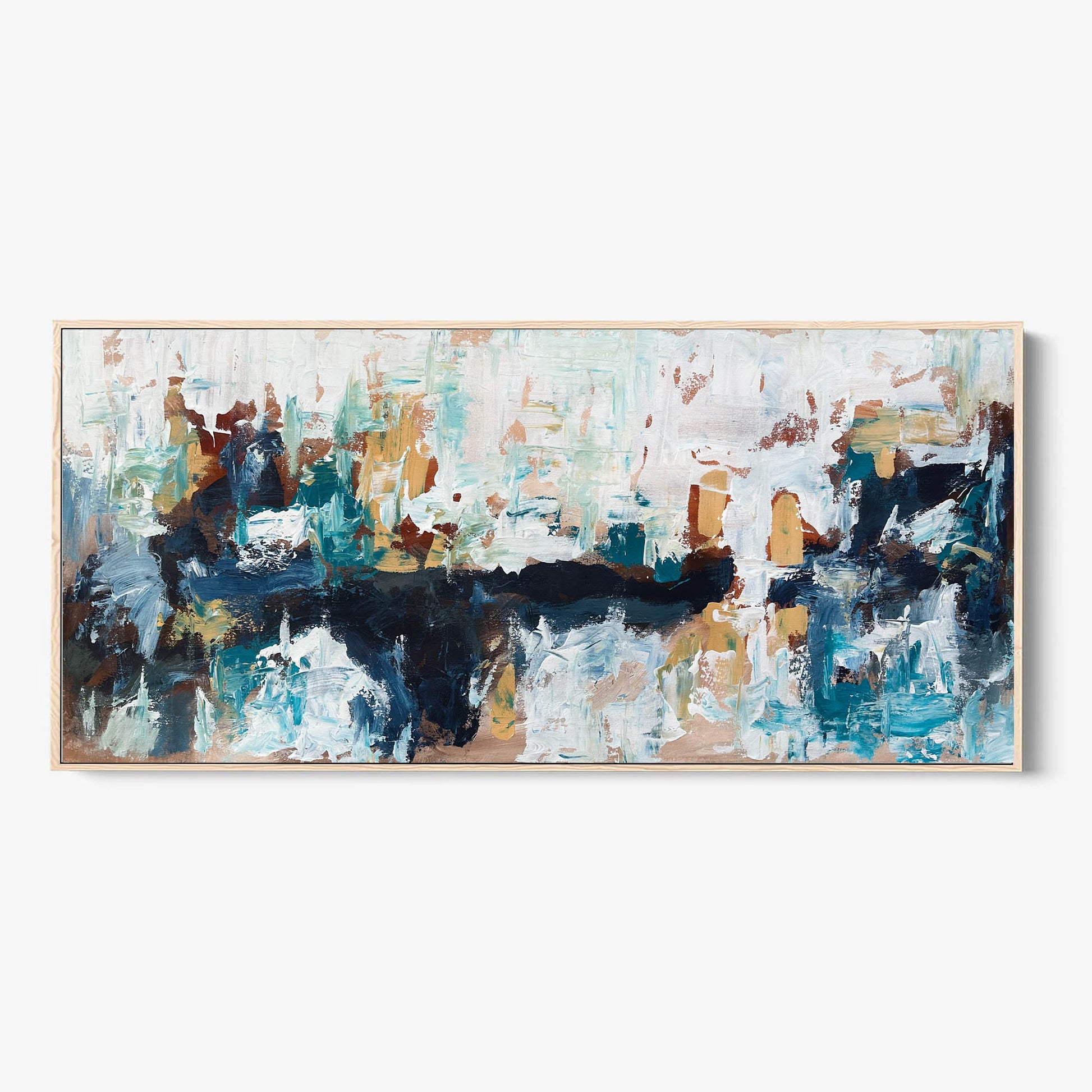 Indulge in this stunning 150x76cm original painting by artist Omar Obaid. With textured teal and navy blue brushstrokes, this extra large abstract art is the perfect addition to any living room. Add a pop of colour and elegance to your space with this one-of-a-kind hand-painted piece.