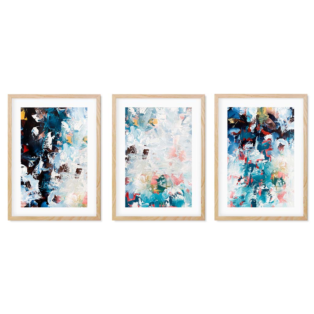 An abstract wall art print set from an original painting. This set is designed to resemble waves in the ocean. It has a mixed colour palette of white, blue, pink and green.