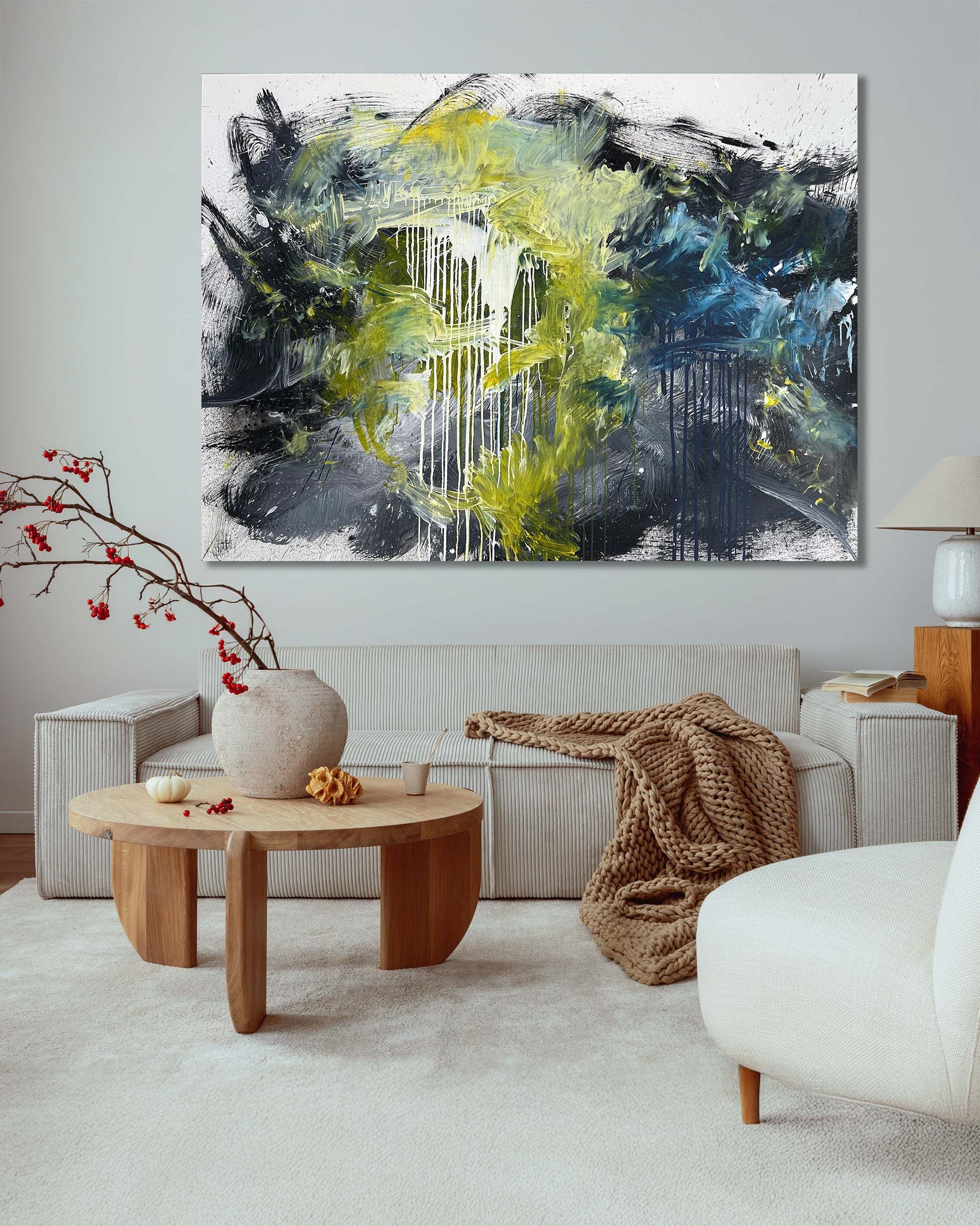 The original artwork is stretched on a wooden frame and it comes ready to hang with your choice of frame colour.