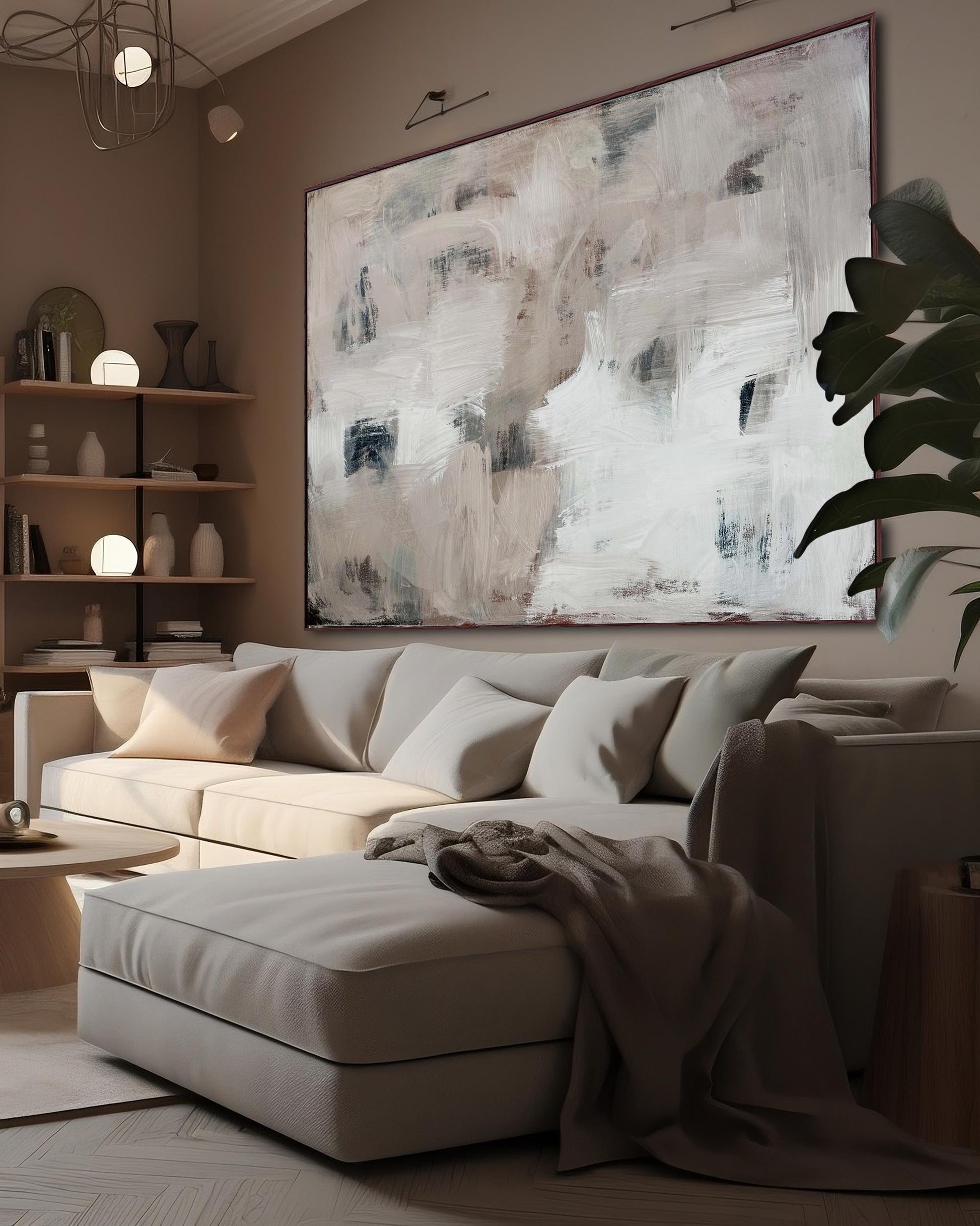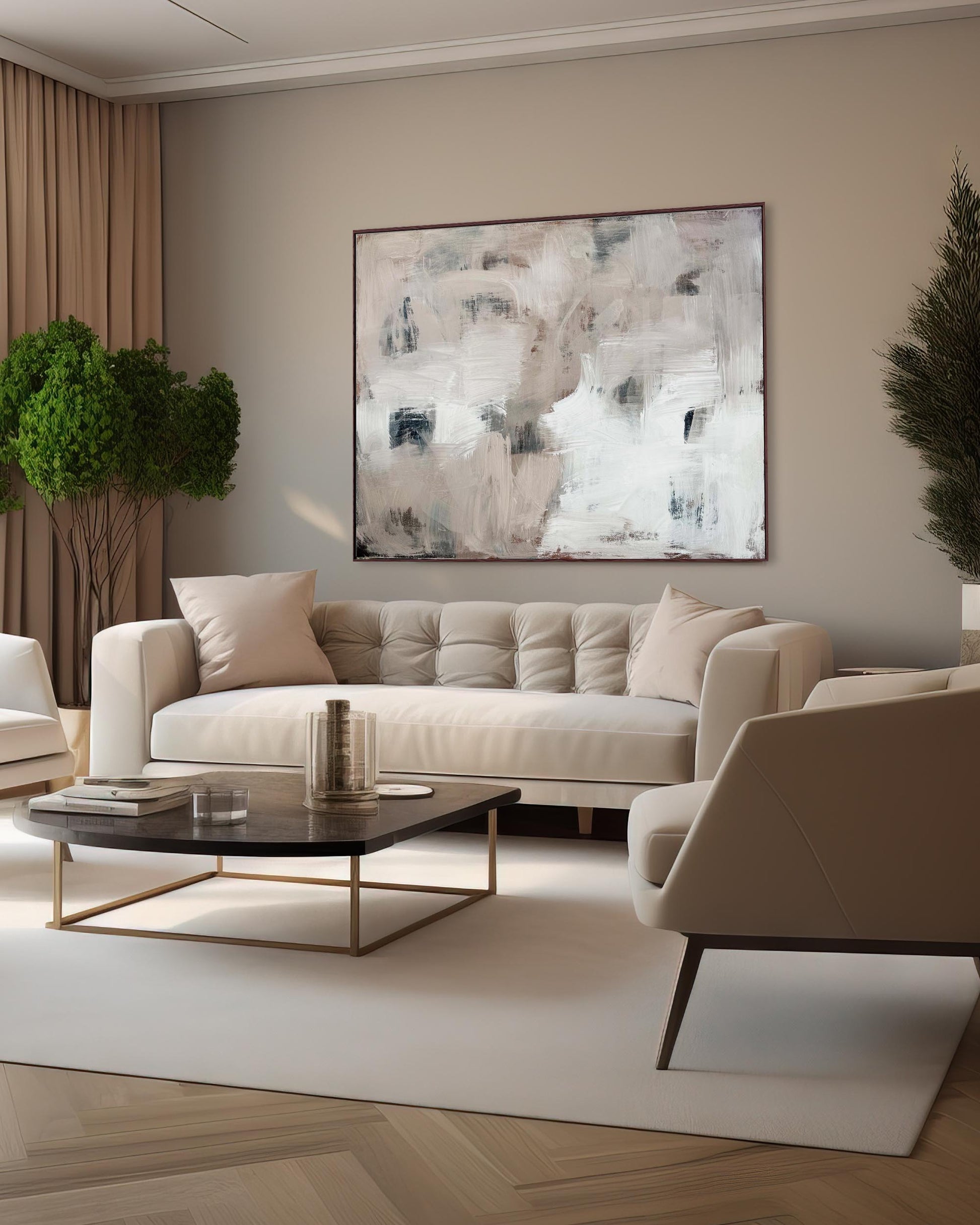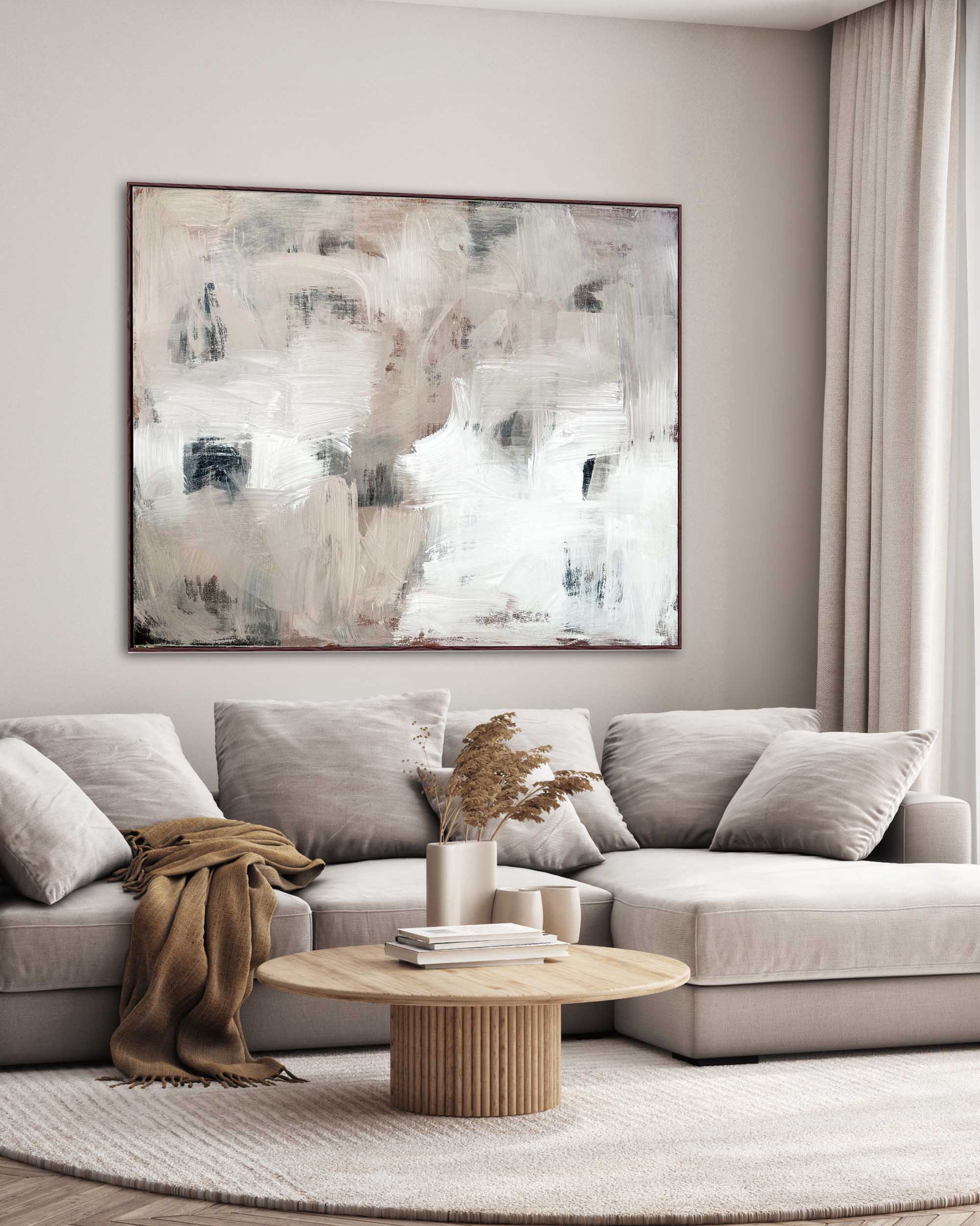 Elevate your space with "Good Intentions IV," an extra-large original abstract painting by Omar Obaid. Measuring 150x120cm, this one-of-a-kind artwork showcases expressive brushstrokes in soothing beige and neutral tones. Its dynamic composition and unique texture bring warmth and sophistication, making it a captivating centerpiece for any contemporary interior.