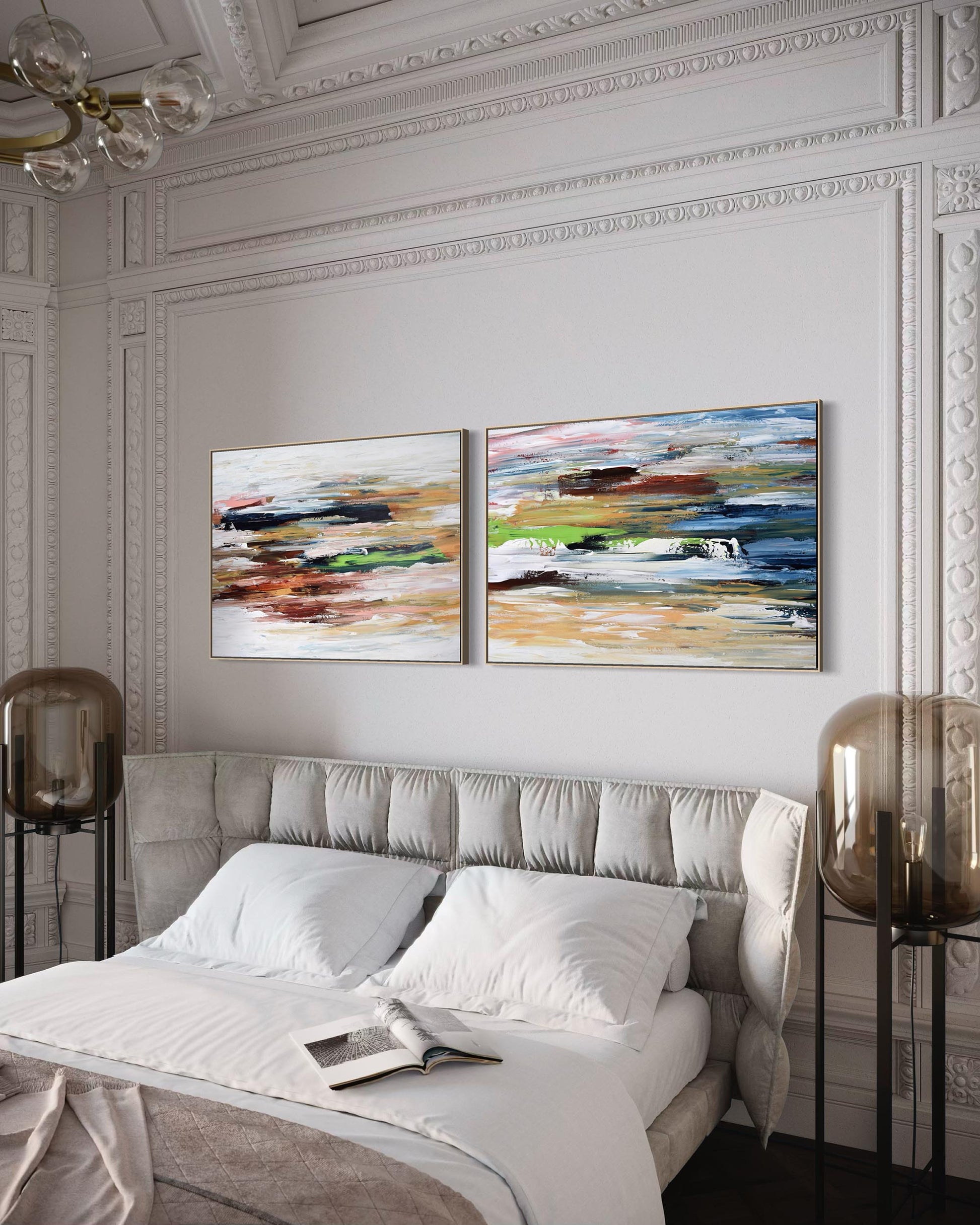 Elevate your house with modern art inspired by nature. Our beautiful handcrafted canvas wall art two-piece set is ideal to hang in bedrooms, living rooms or reading nooks. Serene Autumnal shades of browns, hints of blue and green bring the beauty of the outdoors in with this unique artwork which comes from an original painting. Decorate your walls with beautiful modern art.