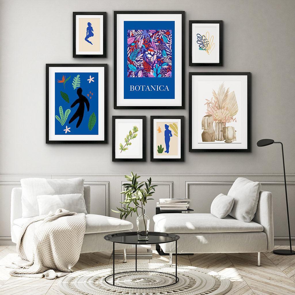 A gallery wall inspired by Matisse, bringing the essence of the great modern master into your home decor. Featuring blue nudes, botanical art, colourful line art, and watercolour leaves and pampas.