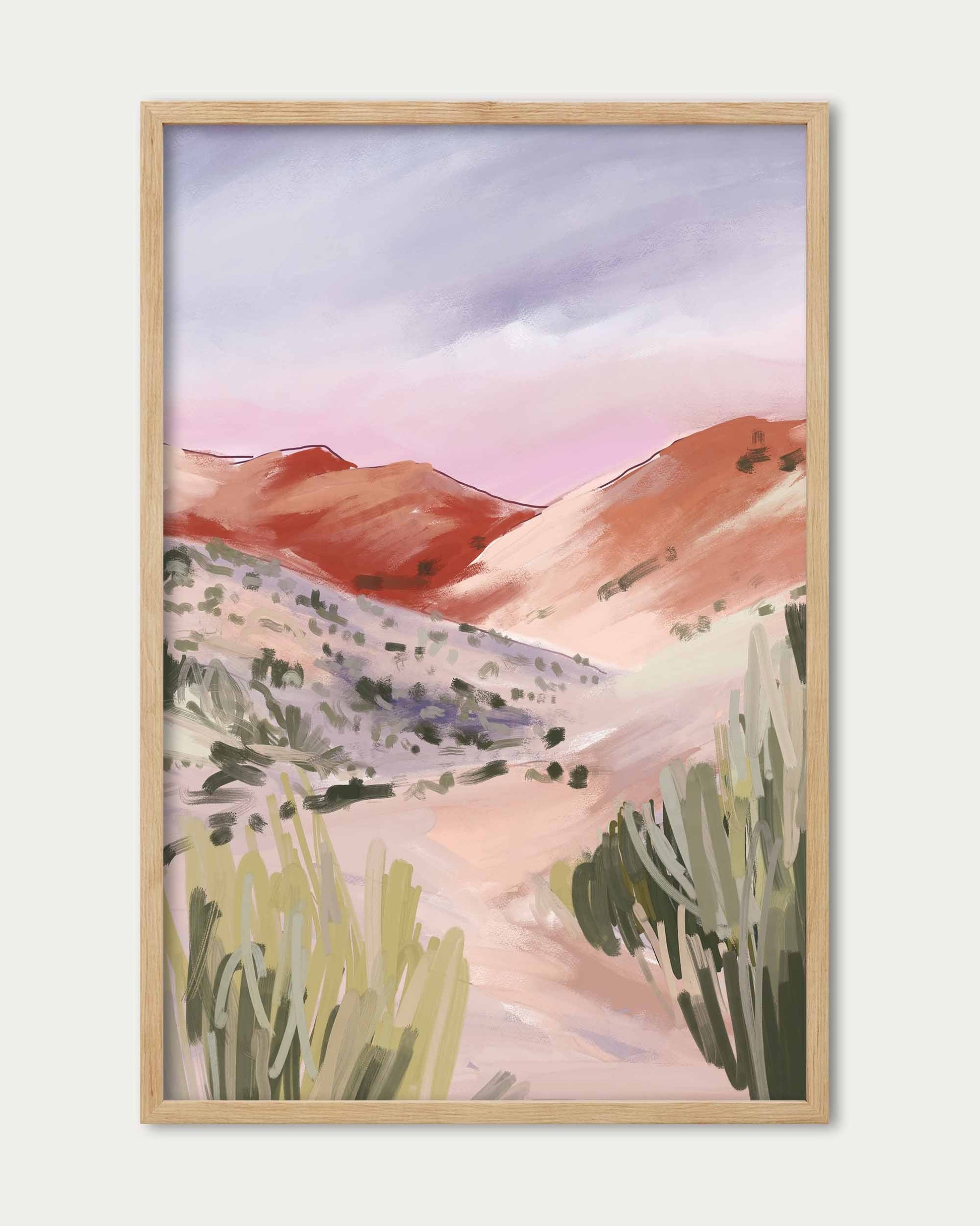 The Over The Hill Wall Art features a delicate watercolor painting of a winding path through the desert. This serene artwork brings a sense of calm and natural beauty to any space, perfect for adding a subtle and peaceful touch to your décor.