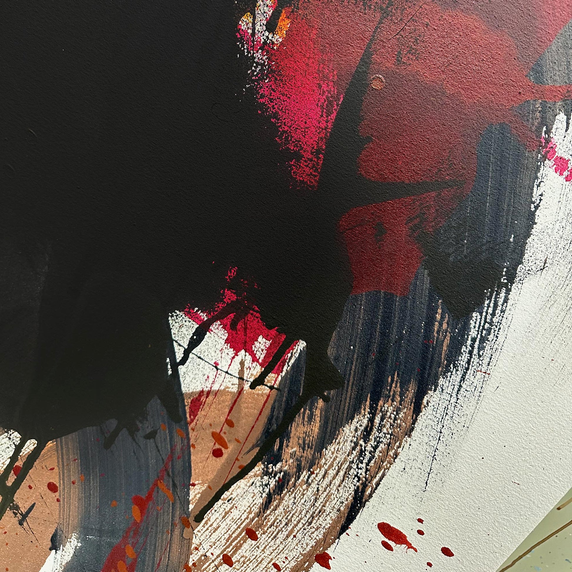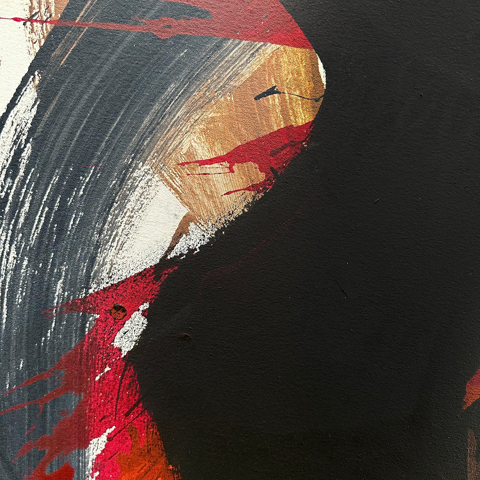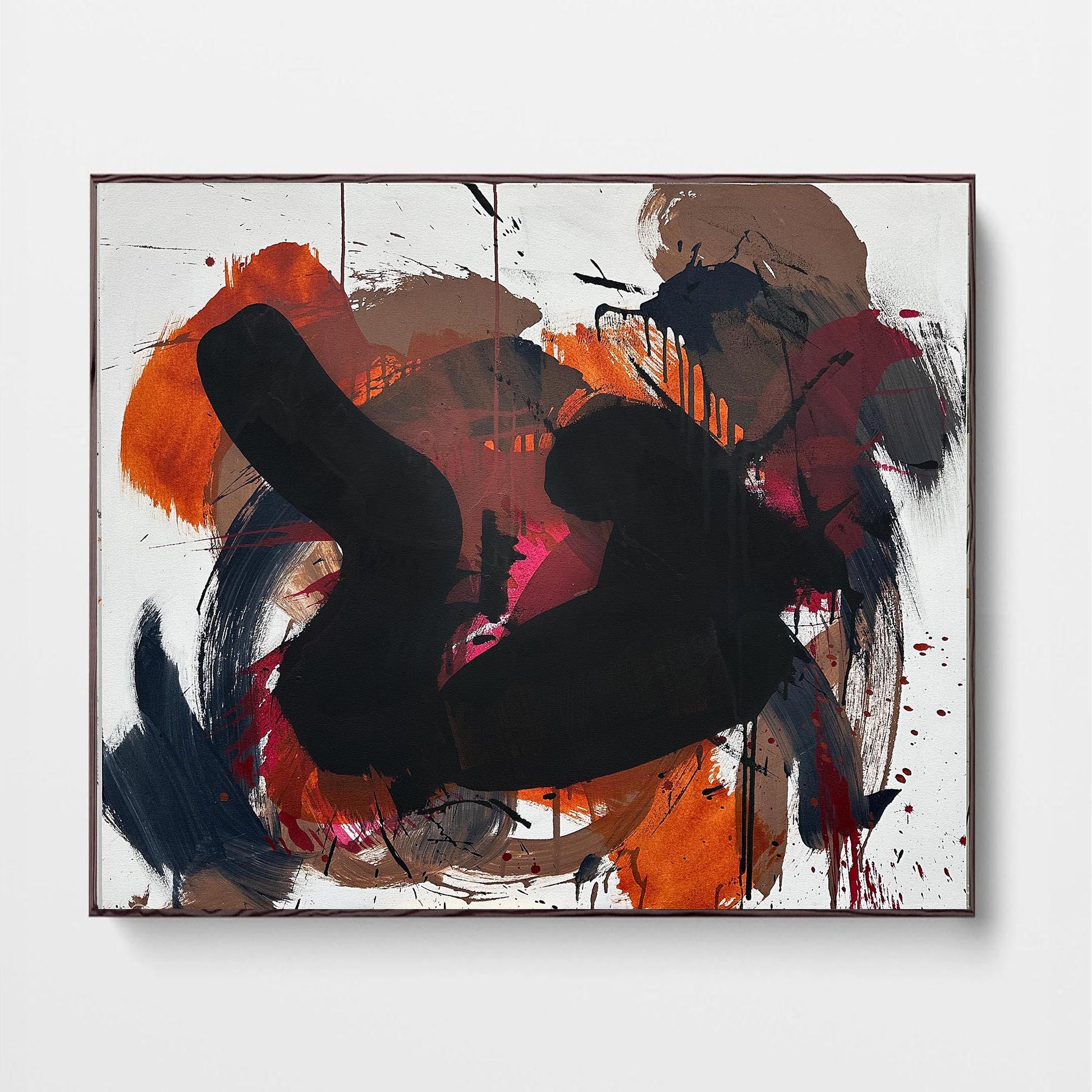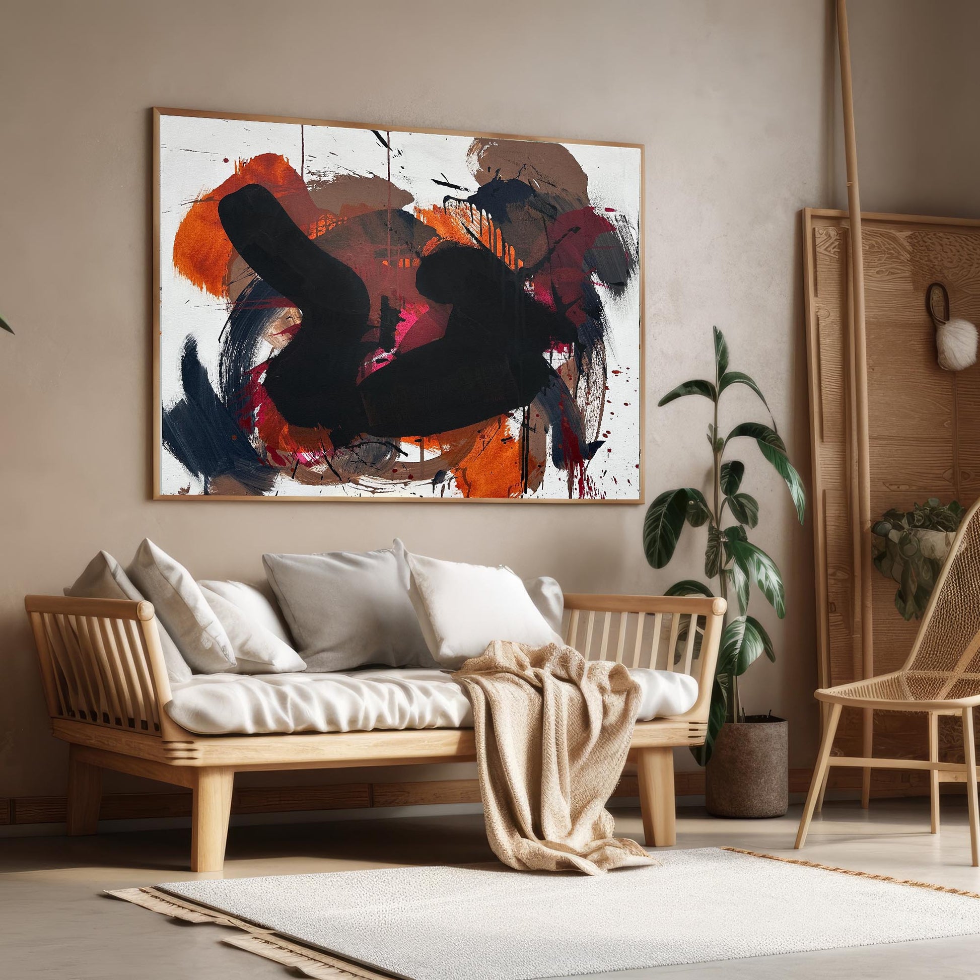 Prospective is a large, one-of-a-kind original abstract painting by London-based artist Omar Obaid. This framed artwork features fluid black brushstrokes set against a dynamic red background, creating a bold and captivating composition. Signed by the artist, it offers a unique opportunity to own a distinctive piece that brings contemporary energy and striking visual impact to your space. Don’t miss the chance to make this exceptional work yours.