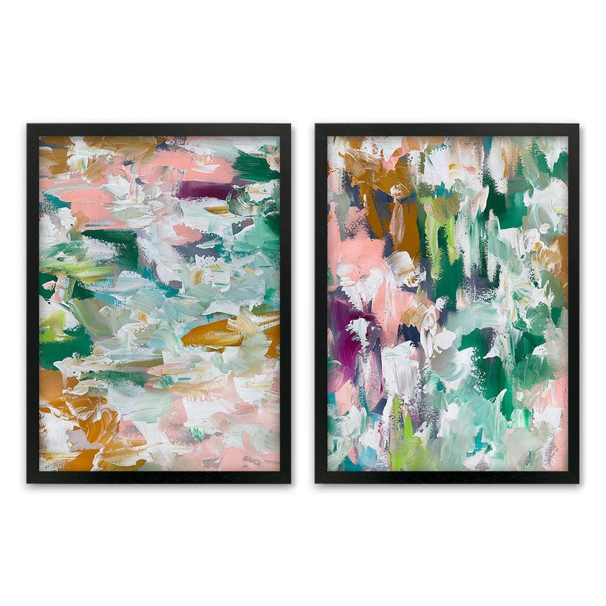 This colourful large abstract wall art print set has a burst of colour with its mustard gold tones, pink and green colour palette. Enrich your walls with a piece of nature with this stylish abstract landscape pair.