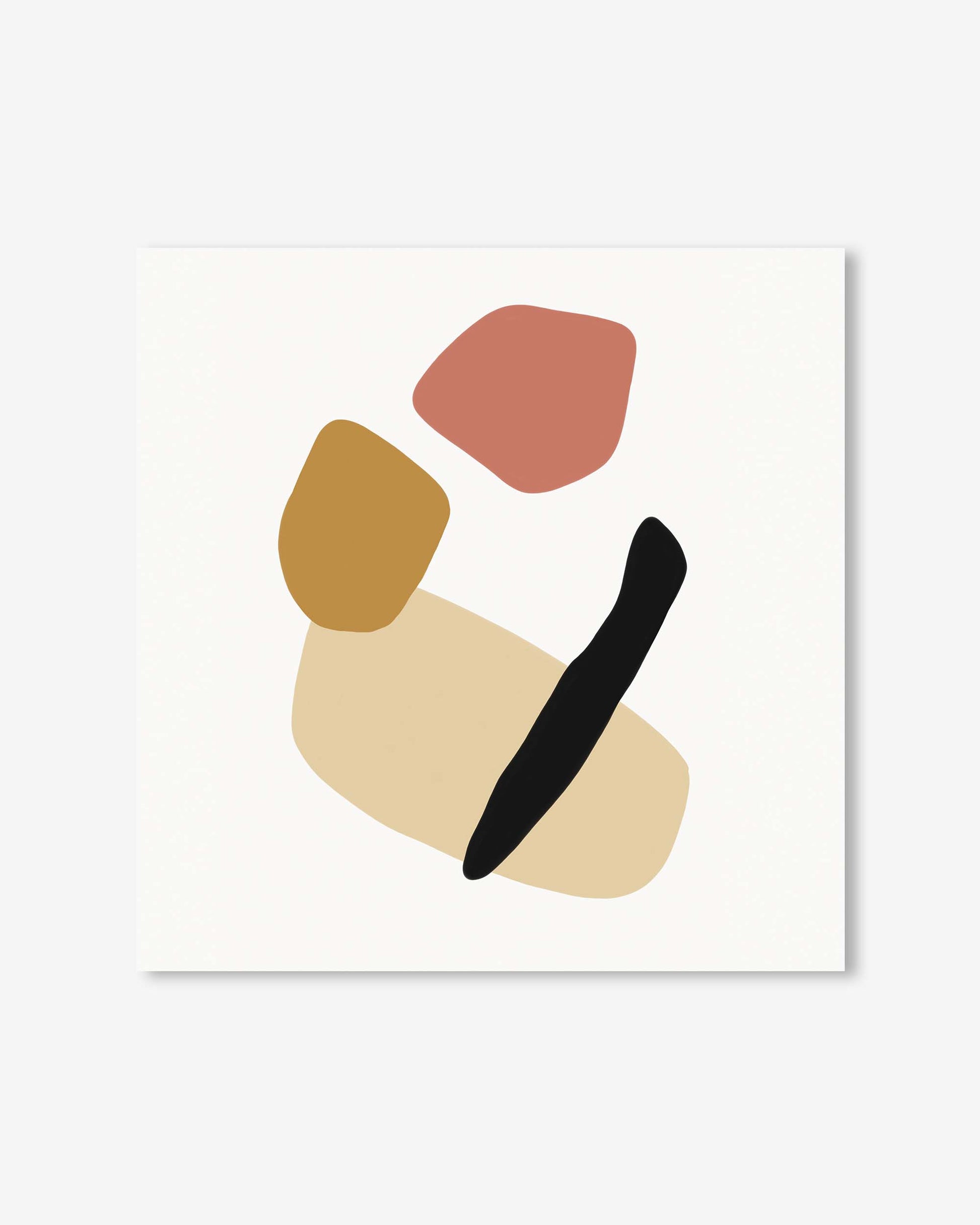 This modern illustration of three abstract shapes in neutral beige, gold and coral pink feature beneath a black stripe. Sitting in a square frame in your choice of colour, black, white, grey or oak, this contemporary hand-illustrated art print will transform any blank wall.