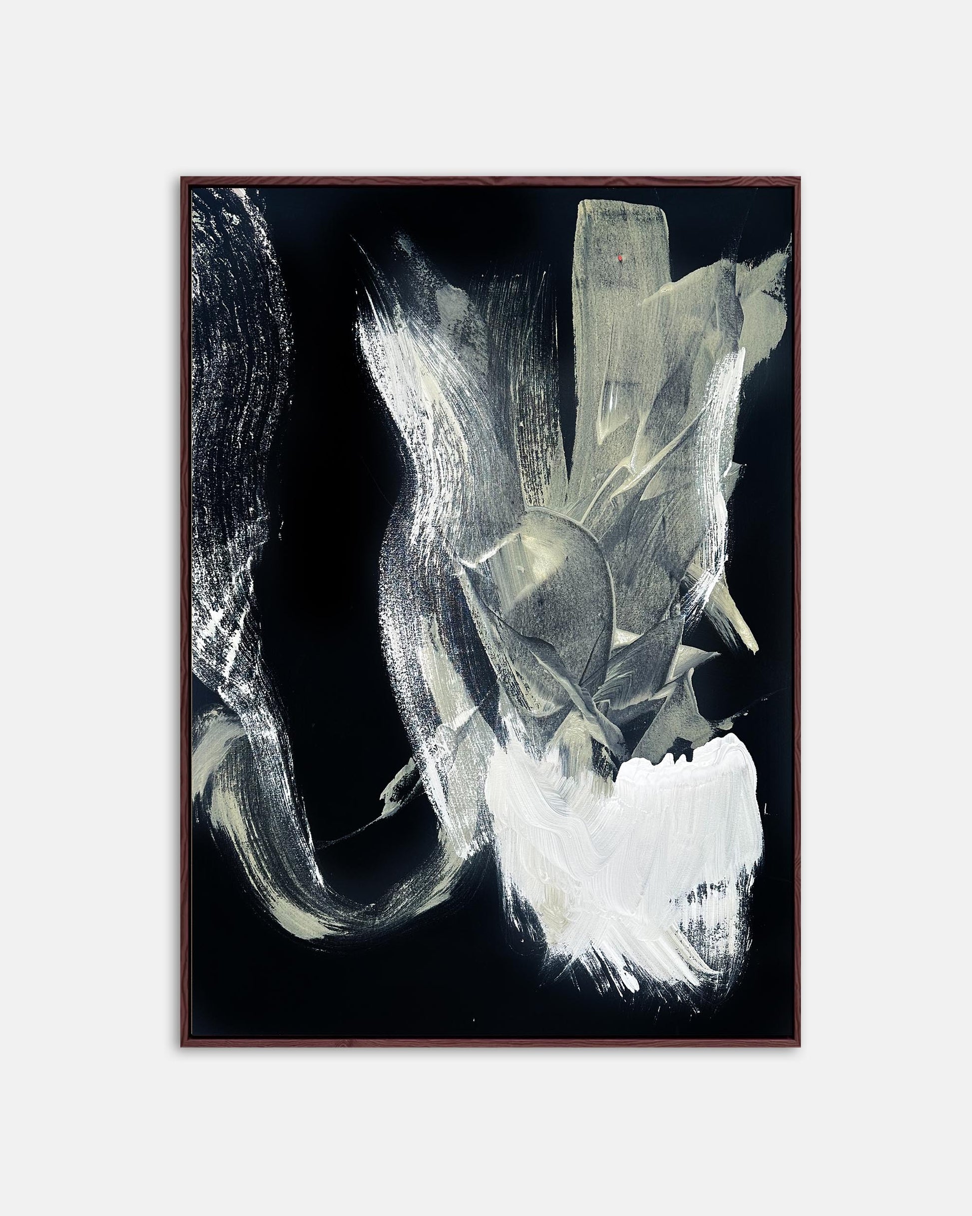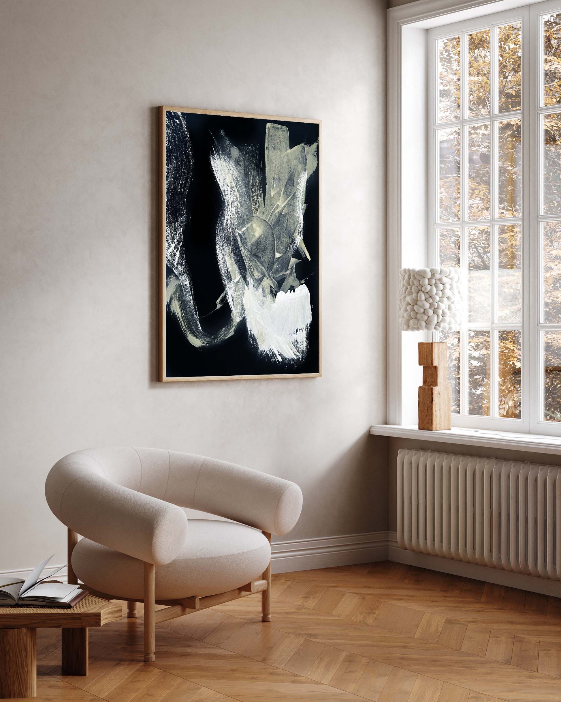 The original artwork is stretched on a wooden frame, and it comes framed and ready to hang, with your choice of frame colour.