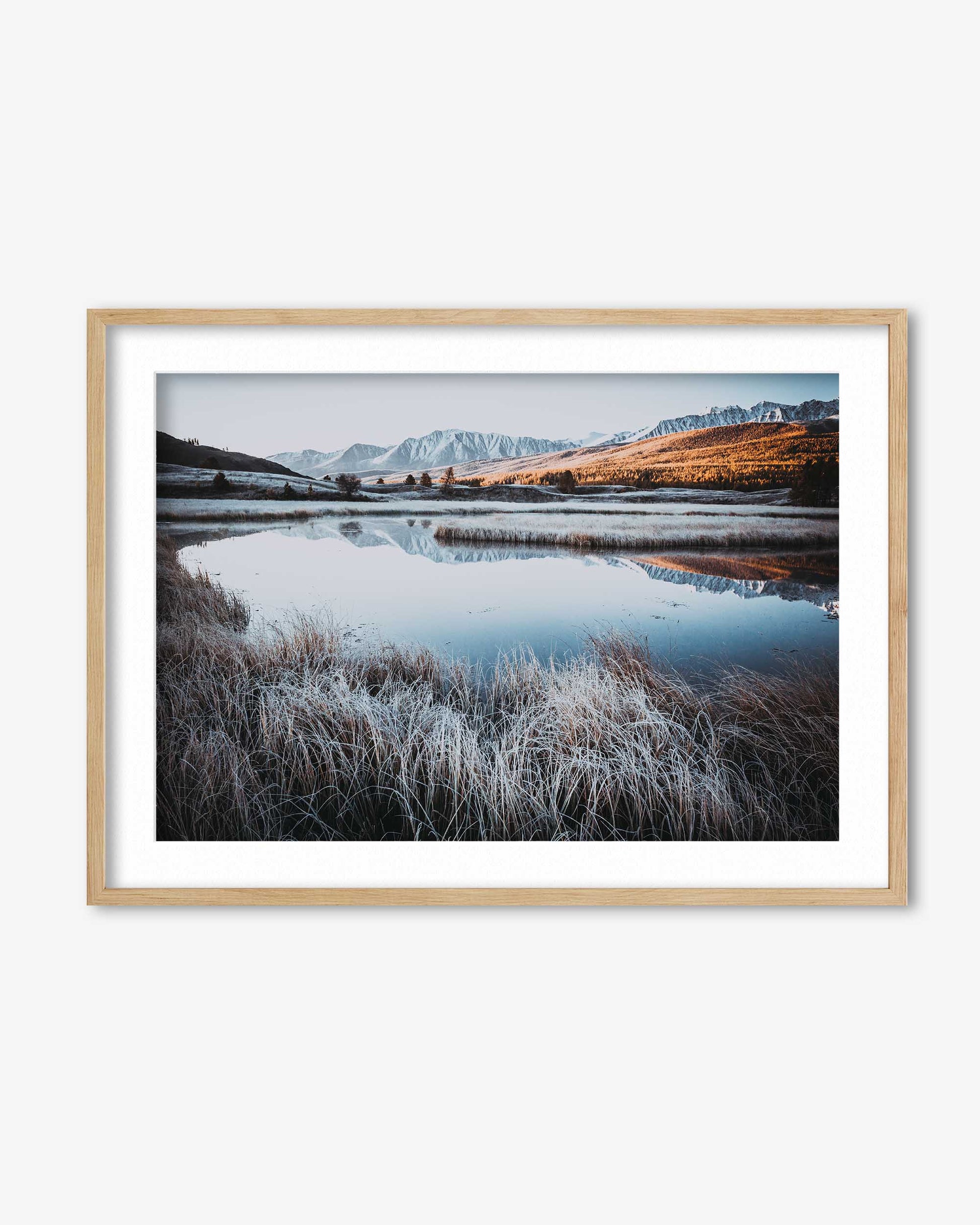 Escape into tranquility with this serene winter lake art print, where stillness and natural beauty converge. Captured through fine art photography, the composition reveals a pristine frozen landscape with distant mountain peaks anchoring the horizon—each element rendered with crystalline clarity and atmospheric depth. The cool palette and hushed tones evoke a sense of peaceful solitude, transforming your wall into a portal to untouched wilderness. This landscape print brings contemplative elegance to any room, whether creating a focal point in a bedroom, study, or living space. Ideal for those who seek to infuse their interiors with the restorative power of nature and the quiet majesty of winter's landscape.